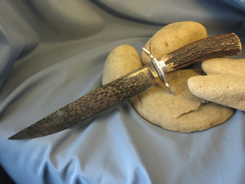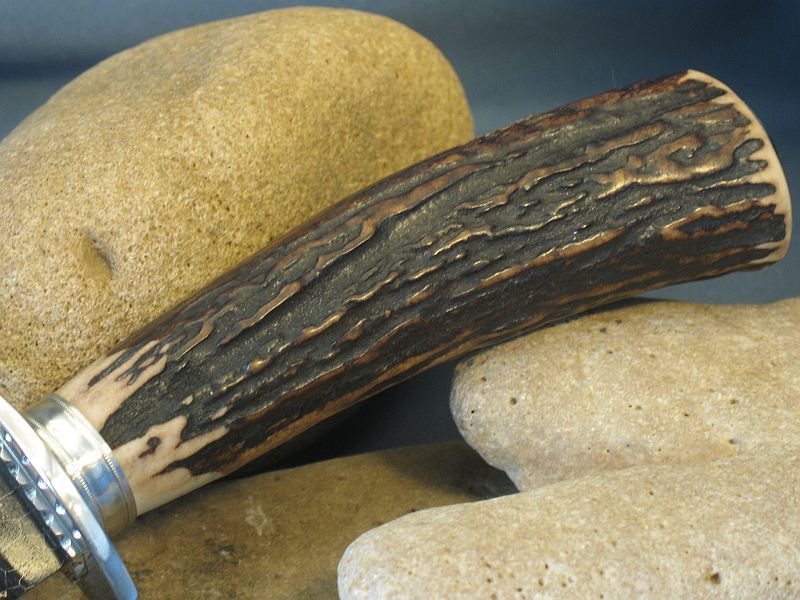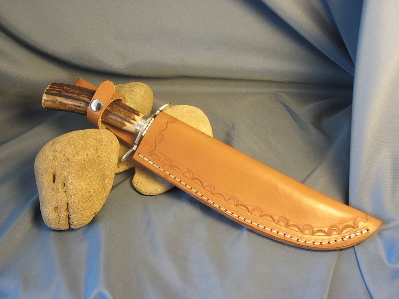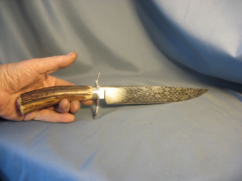 Nice Bowie or fighter with a fine cut of Amber India stag. Balanced right at the guard. It has a 8 3/8 inch blade and is 13 1/4 inches over all. New Sambar stag that is good for either left or right hand. Sheath included. Made out of 52100 nickel plated bearing balls. Sharp. I would like "SOLD" and 12.00 for priority mail in USA. My e-mail and paypal address is dangraves4923@earthlink.net