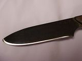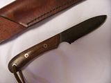 Mostly I read the posts in the knifemakers threads and learn. A couple times a year, I'll finish a blade that's worthy of a picture. It's an 0-1 convex grind, cold blued, & has a Bubinga handle. Sheath is just a wet molded quickie.