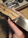 Here are some WIP photos of the project I'm doing with the unfinished EDC 4 that recently surfaced. These blanks came from the old oak tree at the end of the movie "Shawshank Redemption". The blanks are pretty wormy and full of holes, but they have been stabilized. I laminated black micarta spacers. The blank I picked was the most solid and had lots of interesting character.