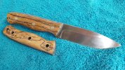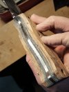 The owner asked me to add a little more thickness to the front of the handle compared to a typical S!K handle. After consulting a little bit, we decided to implement more of a bushcraft style handle. I'll put just a little flare to it, and we also decided to fully capture the lanyard hole with the handle, and include a lanyard tube. All pins are stainless and brass mosaic, and the tube is stainless.