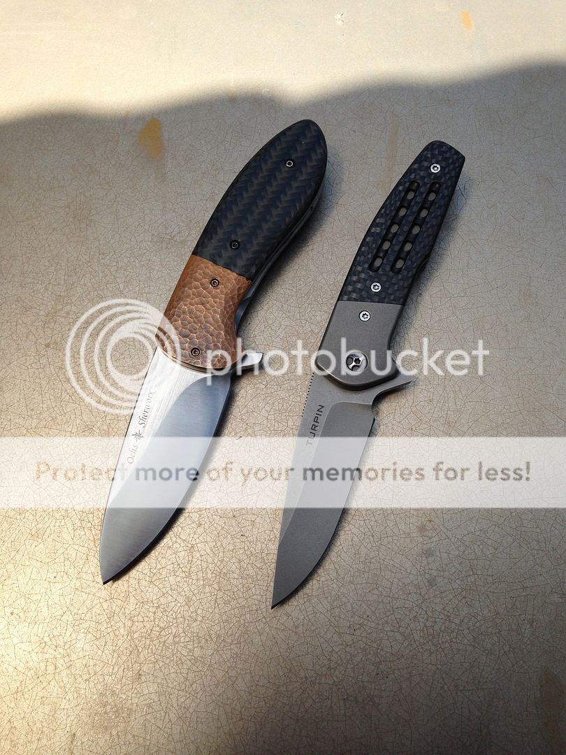 handle: Hot hammered copper bolsters with carbon fibre inlays, and hot hammered copper backspacer.