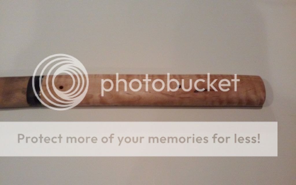 A few months back, a buddy of mine asked me to strip the ugly maroon lacquer off his Katana's Shirasaya. I was pleased when I found that the Saya was a fairly nice wood of unknown species and a bit of figuring at the top. Unfortunately, the Tsuka was some ugly lookin' wood, similar in hardness and grain pattern, to White Oak and had many worm holes and voids filled in with some form of Wood filler. In all honesty, this was uuuggly and we both (me and the owner) agreed it should be replaced. This decision ended in a bad way, and a good way. Good, because, despite some highly noticeable blemishes, the Tsuka came out beautifully. Bad, because I never want to make one again xD