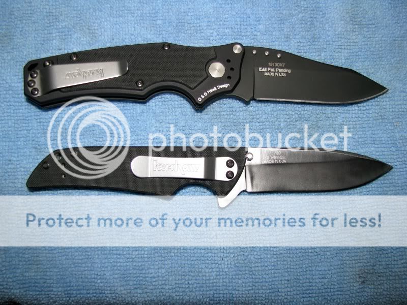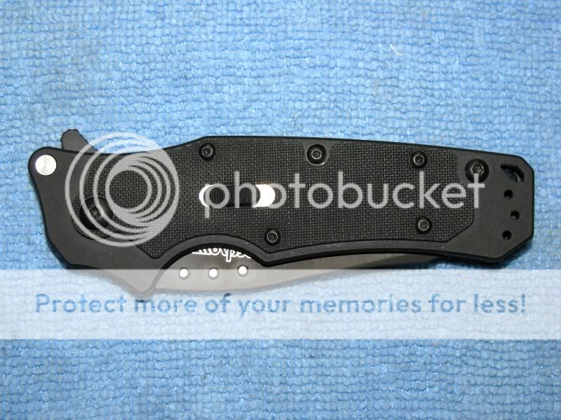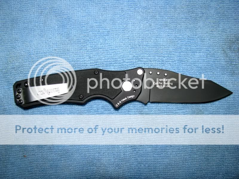 And not the last! As I understand it, this one will no longer be offered. 1910CKT "RAM". The flipper is the smoothest I've ever tried. The only sound it makes is a subdued "click", as the blade locks into place. The blade locking mechanism is something that is new to me, consisting of a sliding tab located on the left side of the grip. Plenty easy to use (for me), either right or left handed.