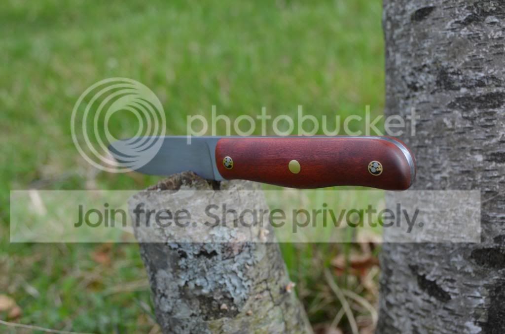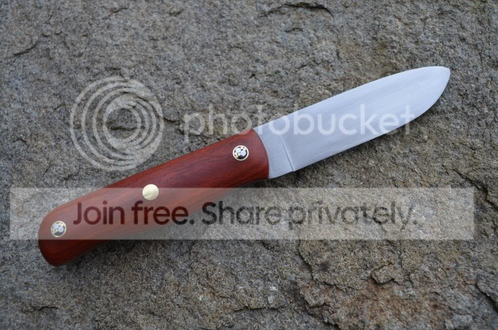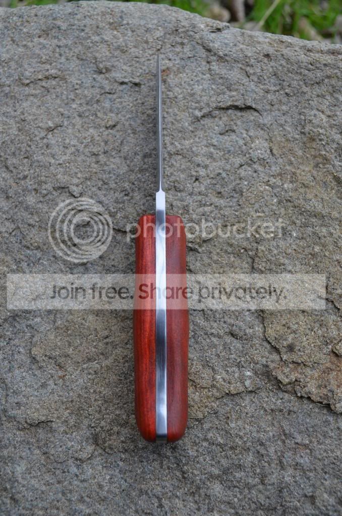 Here is the first knife I have made, from a bar of steel I ordered from Aldo(1084). My first three knives were made out of files. I am using a 1x30 and 4x36 grinder to profile and grind the bevel. This knife was made for my sister it has a 2 1/2" blade and OAL is 5 3/4".