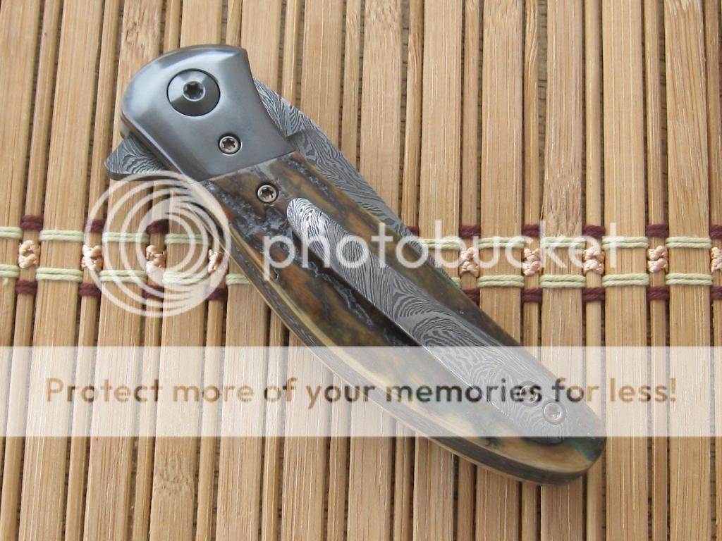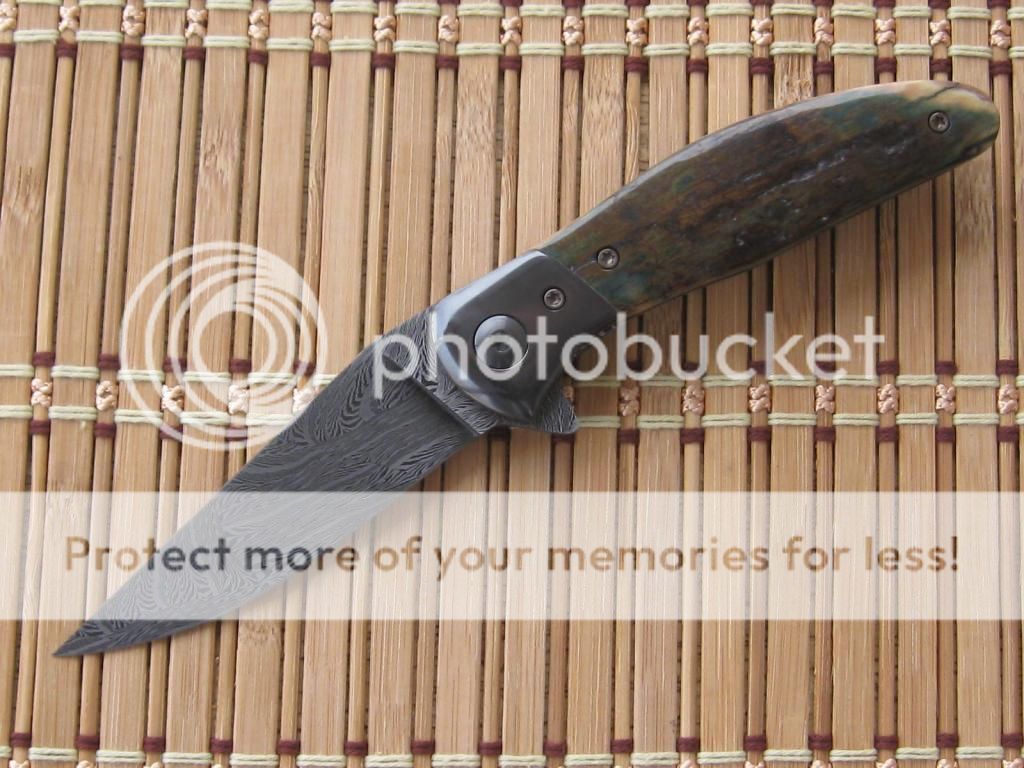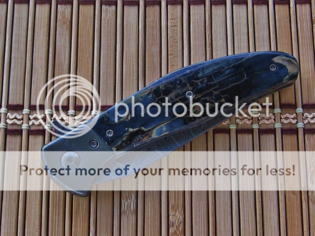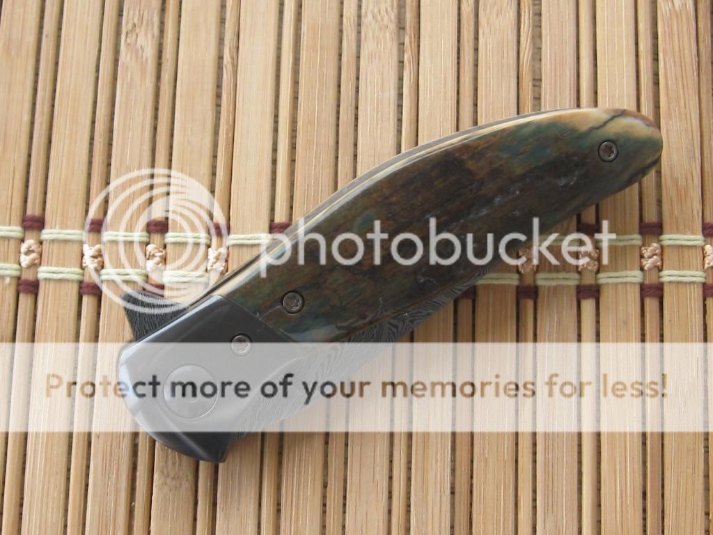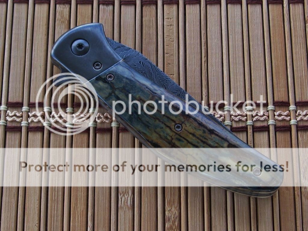Here is my first for 2015. I spent most of December off of my feet. It was nice to get back in the shop. I still cannot spend as much time as I want but getting there slowly. Enough of that. When Lorien and I did the BingaLor flipper. I knew there would be a slightly smaller version. The original was 4" plus blade. I had enough of the original Damascus billet to make the smaller version. For those that followed along on the Wip you will recognize the similarities. The owner of BingaLor contacted me after he received the original asking if I would make a smaller version. He wanted to stay with Mammoth that was fairly close to the original. That presented a bit of a challenge. As we all know that quality of mammoth is really hard to find. Also a bit pricey when it is found. He was able to find these and sent to me. This has been a great project and a great way to start out the new year.