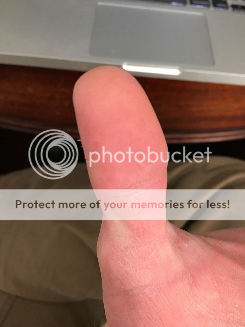 Well, the index finger on my right hand must have been a tad too high on the sheath. I drew the knife in one quick motion - schwick! It hurt but not that bad, but I could tell just from how weird it felt that it was a deep cut. I didn't see it but wrapped it in a clean cloth and held it with pressure over my head for 20 minutes. When I then tried to look at it it was just a bloody mess and still bleeding a lot, so off to urgent care we went.