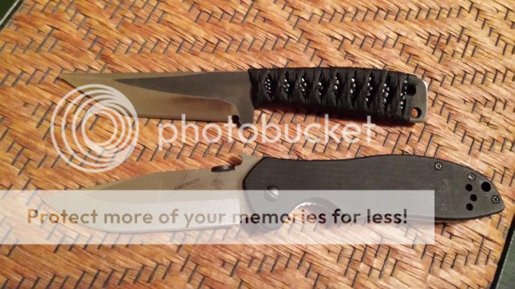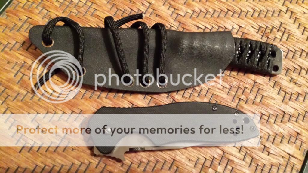 First one is a fixed blade from Hardedge knives. It's a tanto squall in s35vn. Black epoxied wrap with a lizard skin I think underneath. It's been lightly used and carried some.
