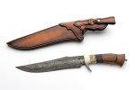 I made these knives with a take-down construction. If you unscrew the nut, the handle fully disassembles into individual segments: a titanium bolster, wood, and inlays of stabilized mammoth tooth. The tooth was stabilized beforehand for added durability. Anyone who’s worked with mammoth tooth on a grinder knows the distinct smell in the workshop when you're sanding this material! The sheath is made from vegetable-tanned leather. These take-down knives were crafted in 2023, and they won’t be made again due to the labor-intensive process involved in their production.