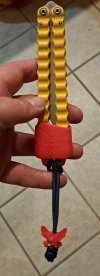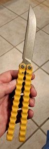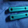 Black blade with aquamarine handles. Has some spots of wear on the anodized handle mainly near the back. Blade has never cut anything or been sharpened, I forgot to remove the slight stains on the side of the blade before taking these pictures. Edge has a couple of tiny almost imperceptible flat spots on it.