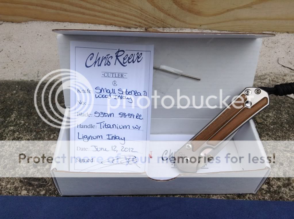 Chris Reeve Small 21 Sebenza - Lignum Vitae Inlay: Knife has been lightly carried by previous owner. I only carried it a day or two. Most of the scuffs are on the clip. Nice Lignum Vitae Inlay. CRK will no longer be making sebenzas with Lignum Vitae Inlay, so this will be a rarity. Lockup is in the 40-50% Range. Blade is Centered. Factory Edge. S35VN Blade Steel. Box, BD Card of June 12, 2012, Blue Cloth and additional papers included. I do not have the leather slip sheath.
