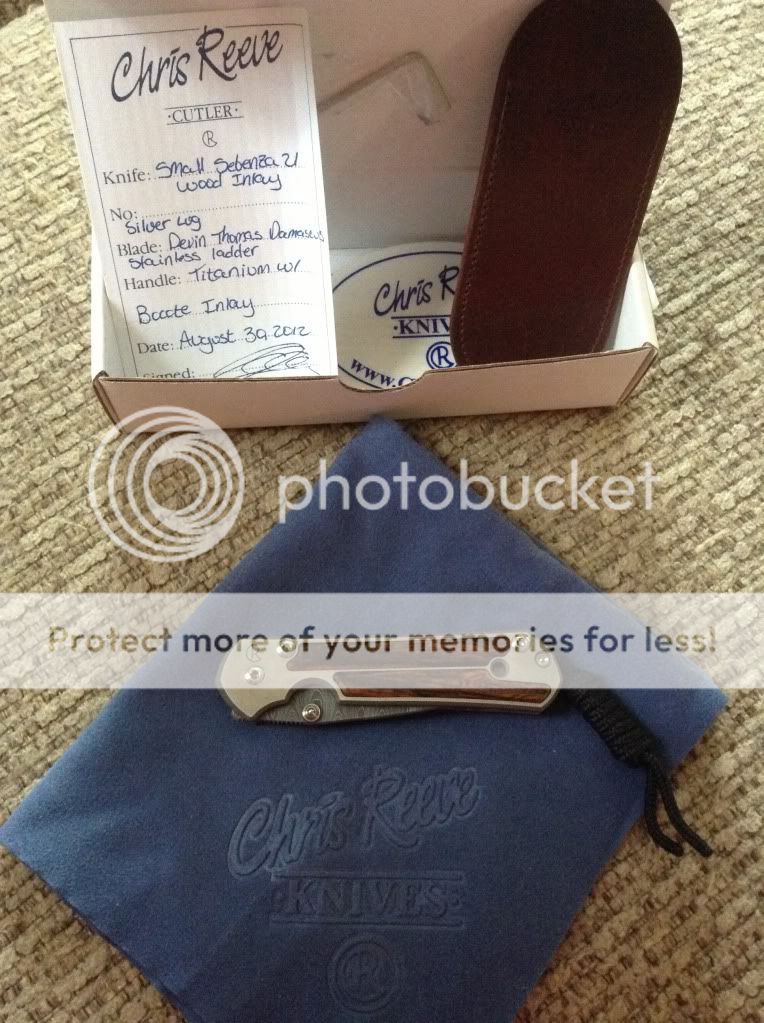 Chris Reeve Small 21 Sebenza - Lignum Vitae Inlay: Knife has been lightly carried by previous owner. I only carried it a day or two. Most of the scuffs are on the clip. Nice Lignum Vitae Inlay. CRK will no longer be making sebenzas with Lignum Vitae Inlay, so this will be a rarity. Lockup is in the 40-50% Range. Blade is Centered. Factory Edge. S35VN Blade Steel. Box, BD Card of June 12, 2012, Blue Cloth and additional papers included. I do not have the leather slip sheath.