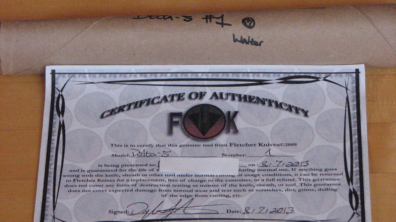 Fletcher Knives Delta-5, #1 new in original wrapper as received from Dylan. Complete with Original Certificate. Unused, unsharpened. Natural Canvas Micarta with Black Liners. $235.00 Price Drop Now $215.00