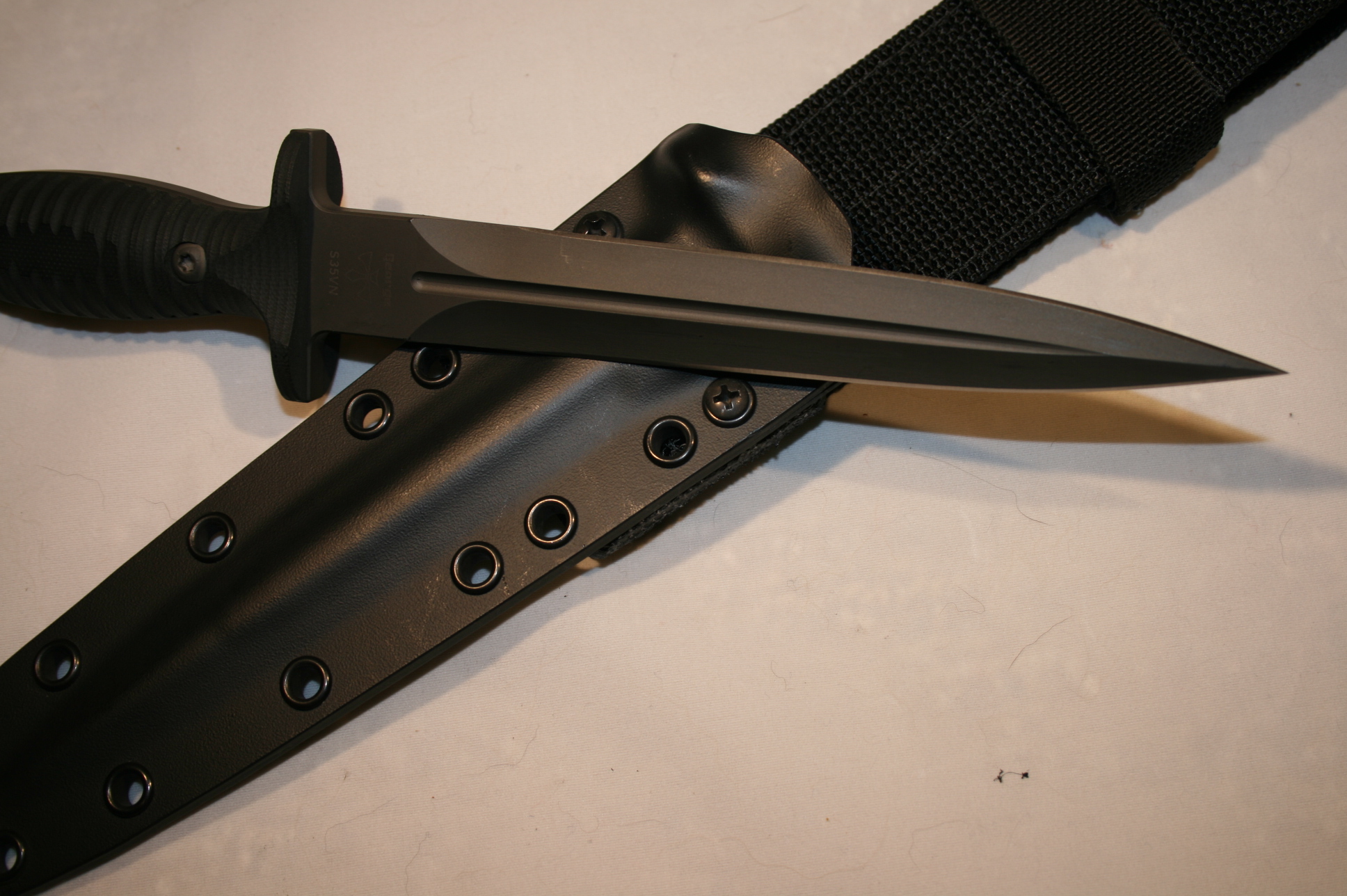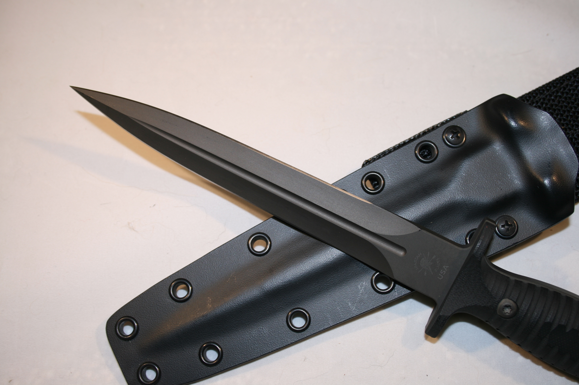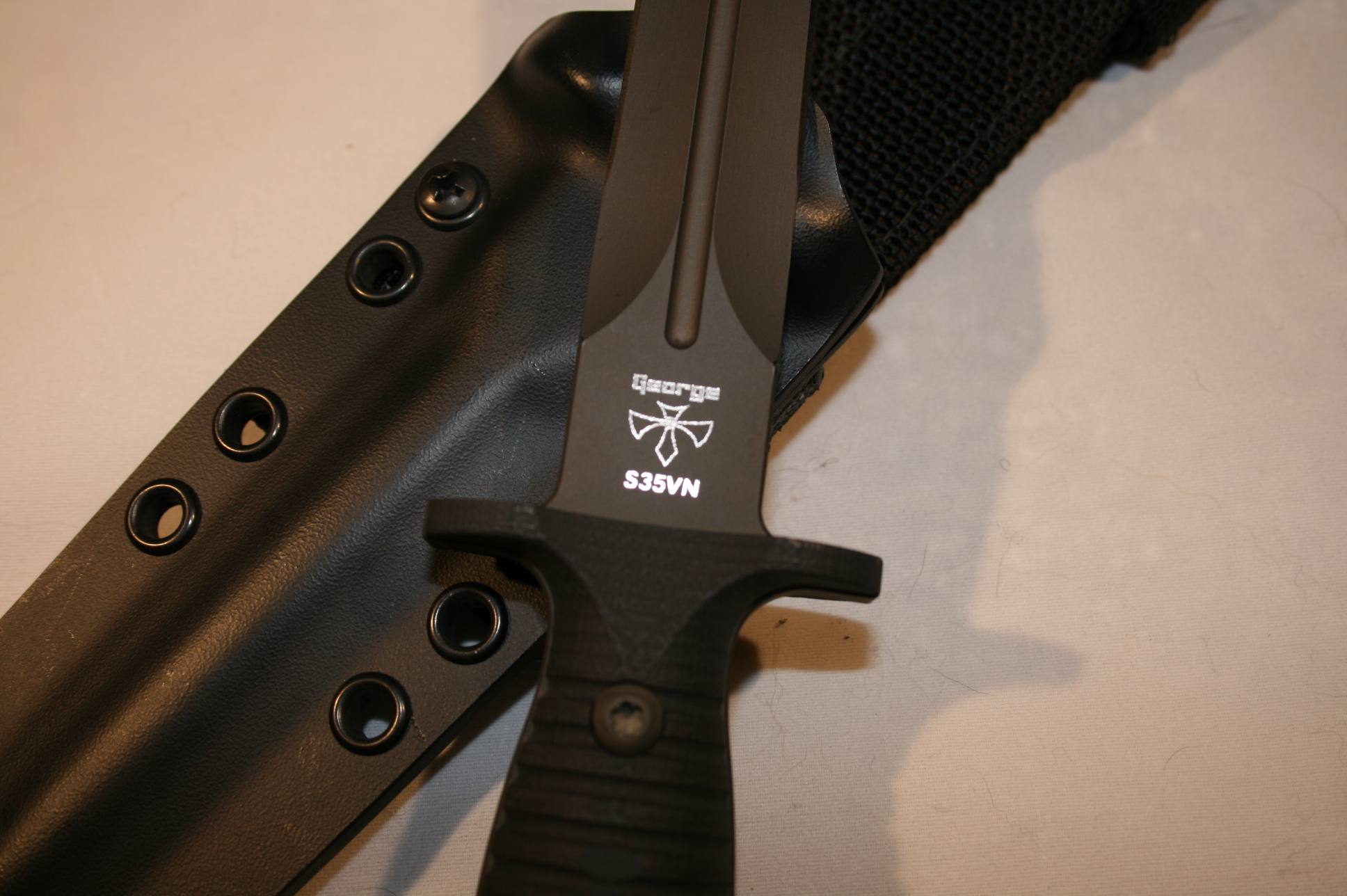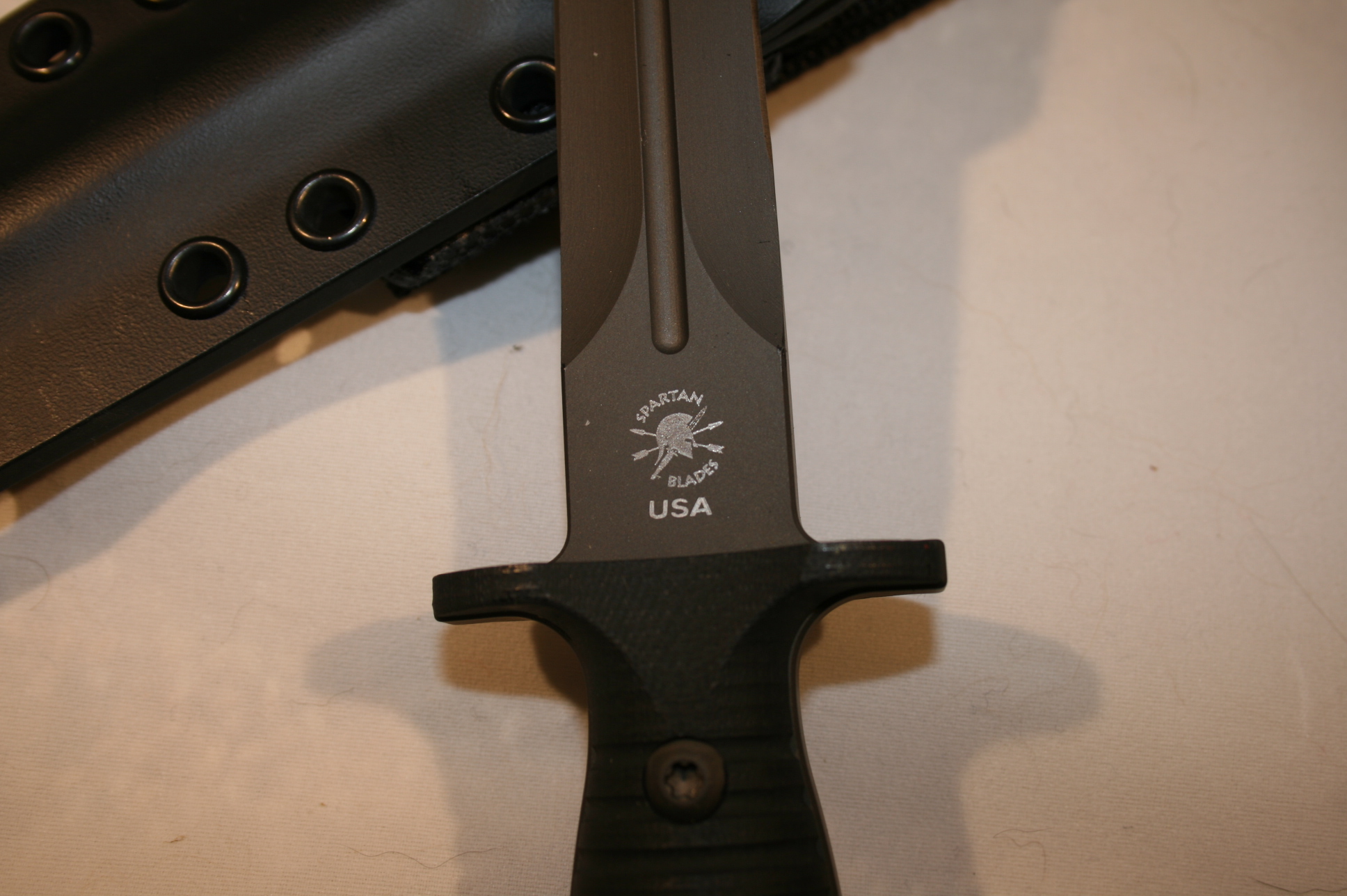 Like new Spartan-George V 14 dagger. Minor sheath wear, never carried, used or sharpened. Blade collaboration knife of the year 2014 between Spartan Knives and Les George. .25" thick, double cryogenically treated and tempered, full tang double edged S35VN steel. A beautiful, strong and sexy dagger. The Spartan Knives website has more complete specs. Comes with custom Kydex sheath. Asking $400 with $10 shipping. Paypal or USPS Money order.