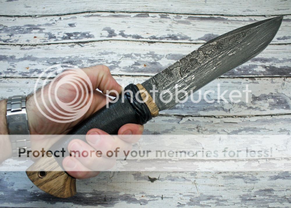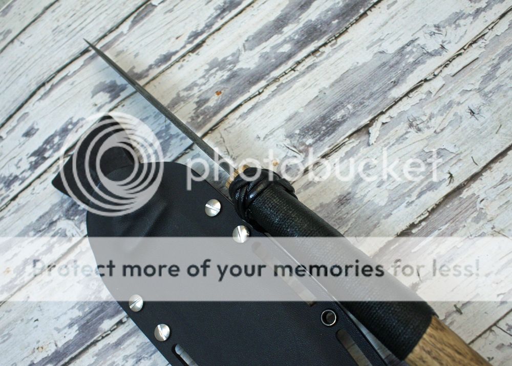 The handle is oak, mortised tang, and pinned together. The tubing is flared, helping to hold it all together. It also has a pin, under the wrap that is peened to provide extra mechanical lockup. The handle is wrapped in micro paracord, and then soaked in epoxy. It is solid and provides good grip.
