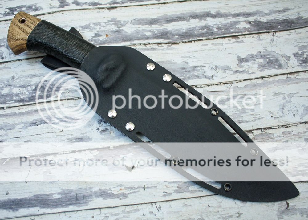 The sheath is kydex with a leather belt loop. The belt loop is reversible allowing for right or left side carry. It also has slots cut for webbing and straps.