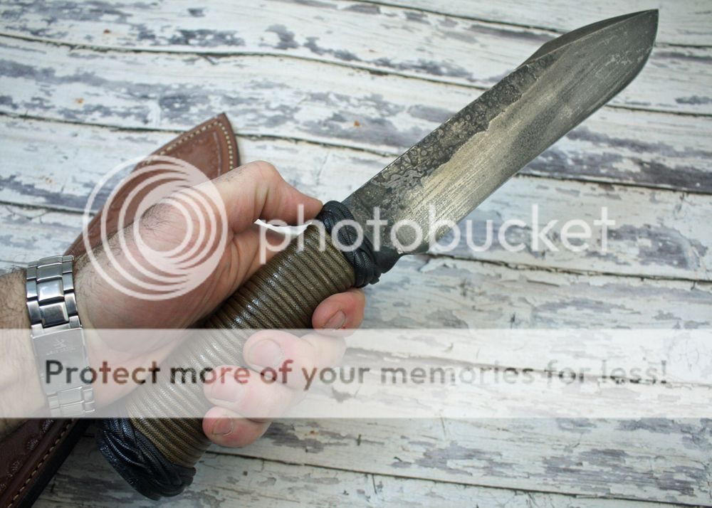 This one is forged out of a bar of 5160. I flare out the handle and create a socket handle so the whole knife is one solid piece of steel. The blade has been ground to 600-800 grit, and then aged to provide a nice durable finish. This a great user knife, and will not scratch up or mar the finish.