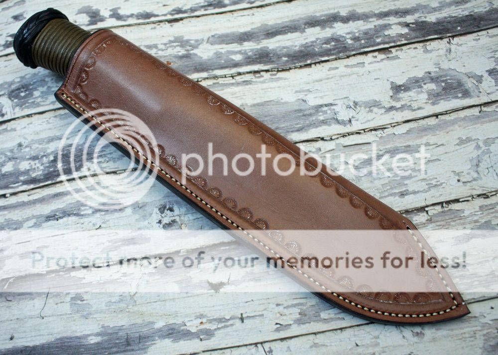The sheath is 7-8oz hand tooled leather from Wickett and Craig. It holds the knife well and draws easily.