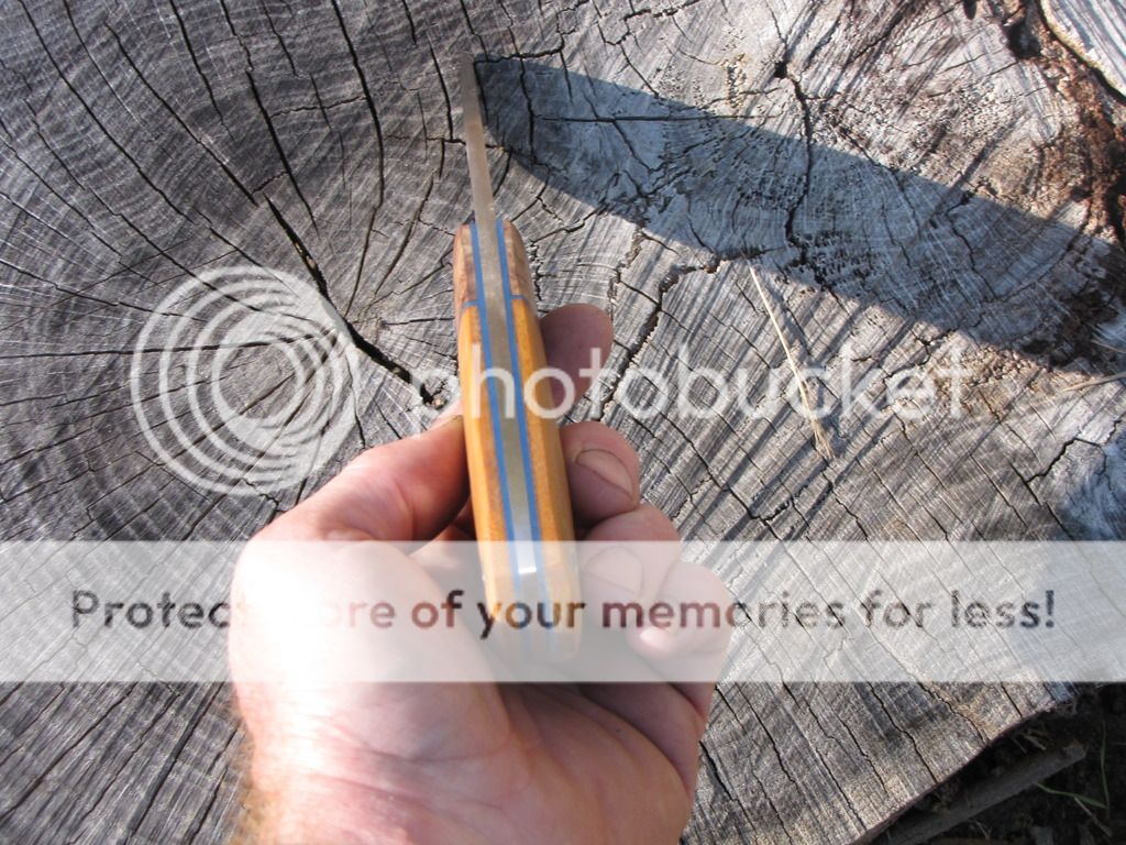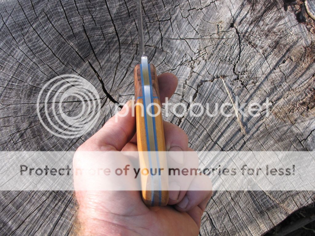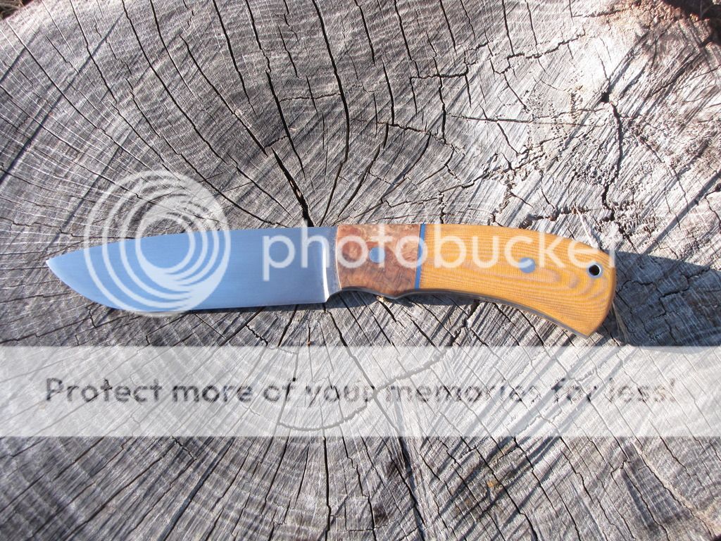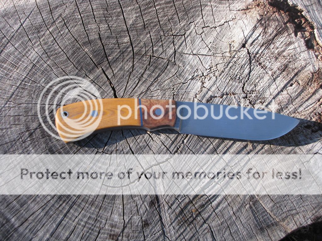 Here's one forged from 3/16" 52100. Blade is 4 5/8". Heat treated 58-59 RC. Hand sanded to 400-grit. Handle is 4 3/8" with red coolibah burl, blue G10 liners, and tan linen micarta. Stianless corby bolt and stainless tube. Comes with leather sheath.