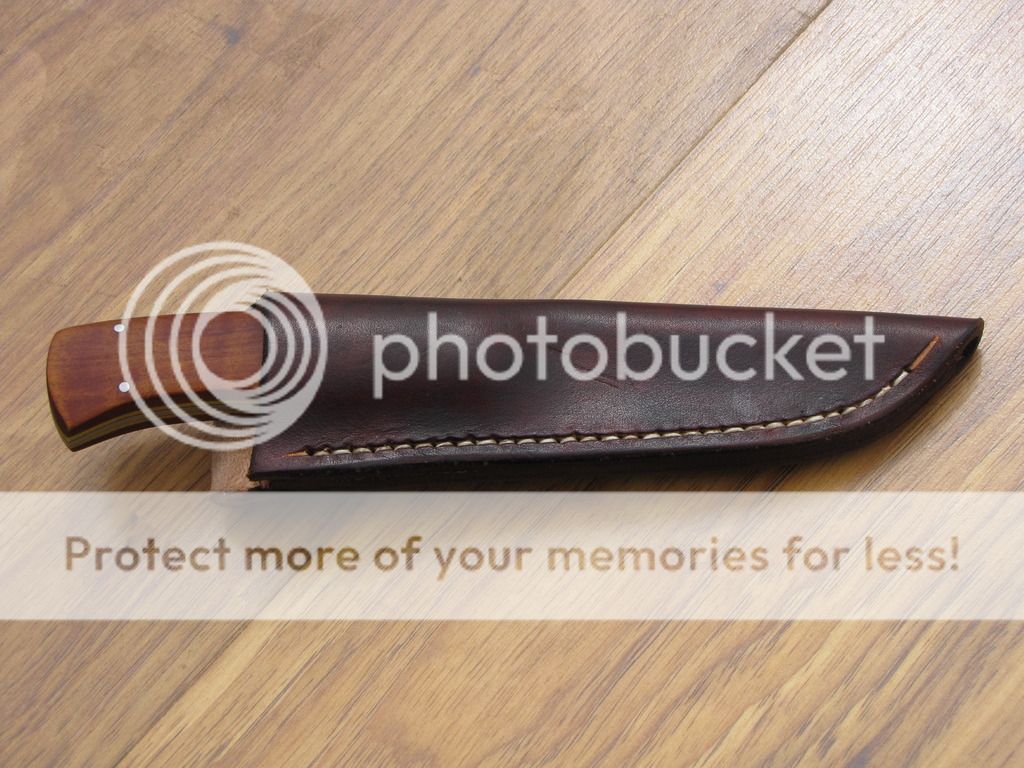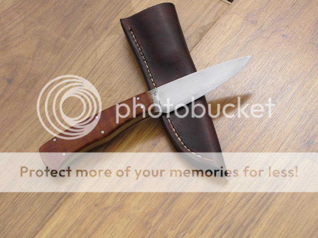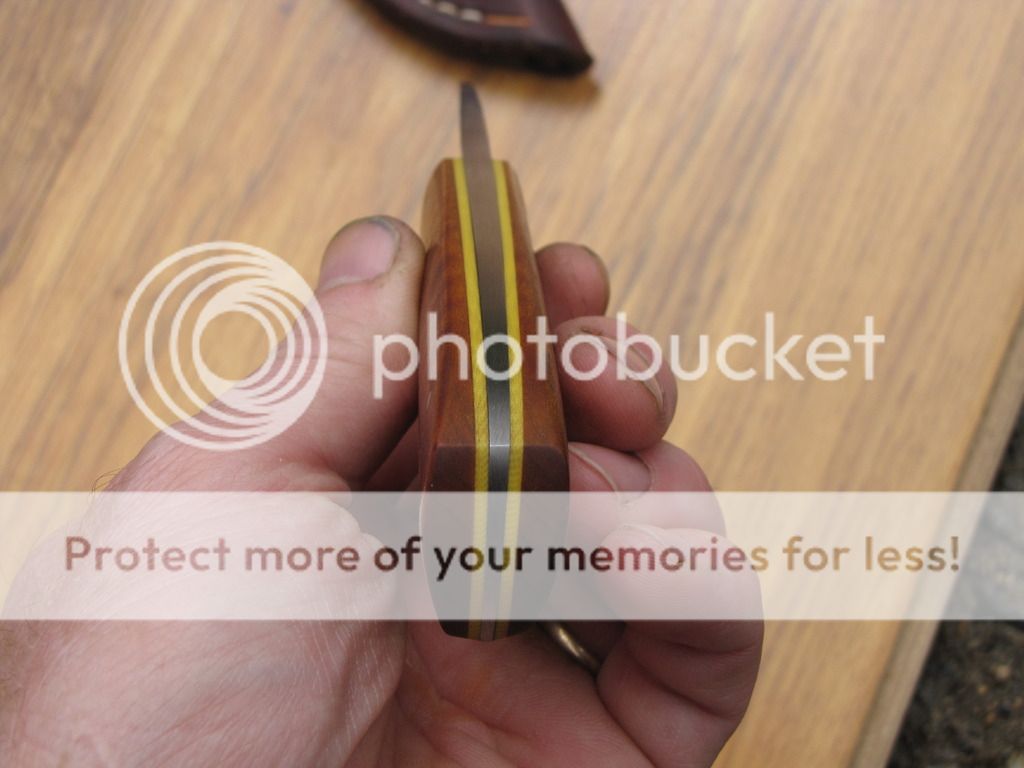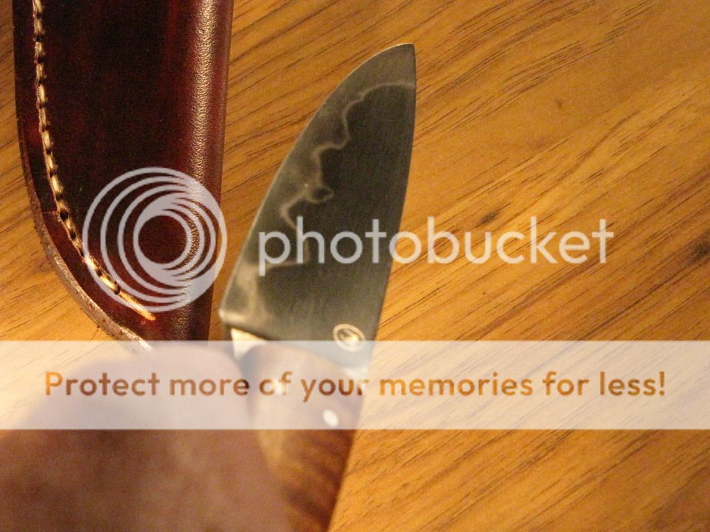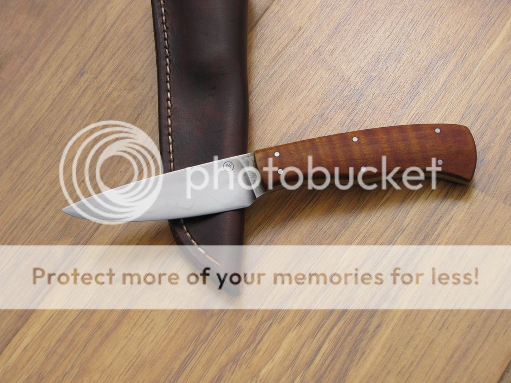 Here's a forged bird and trout from Aldo's 3/16" W2. The blade is 3 5/8". The tapered tang handle is 4" with yellow G-10 liners, stabilized Curly Maple and stainless pins. Heat treated in digitally controlled equipment and clay-quenched in Parks 50. I polished the blade to 1500 and etched it to show the Hamon.