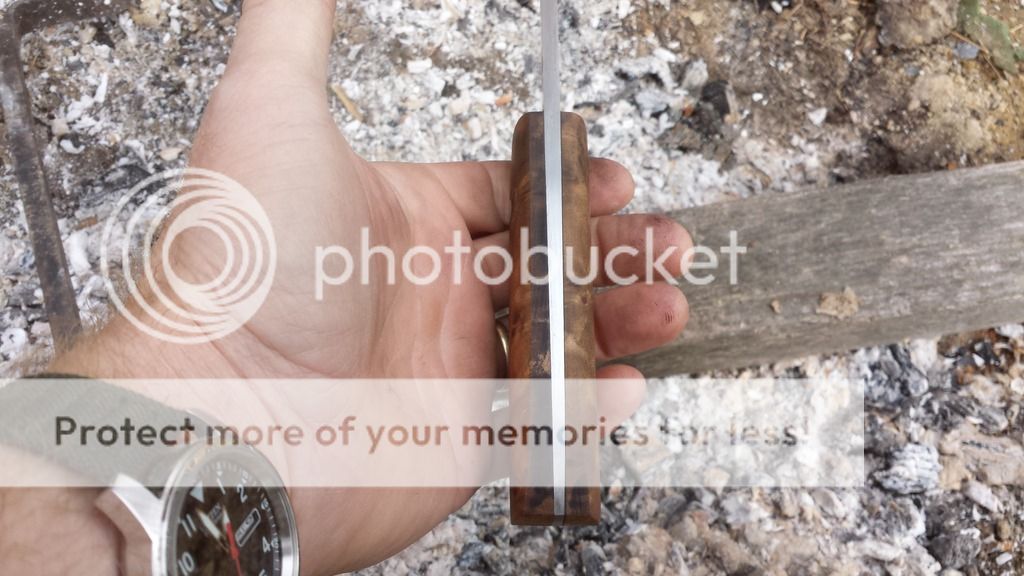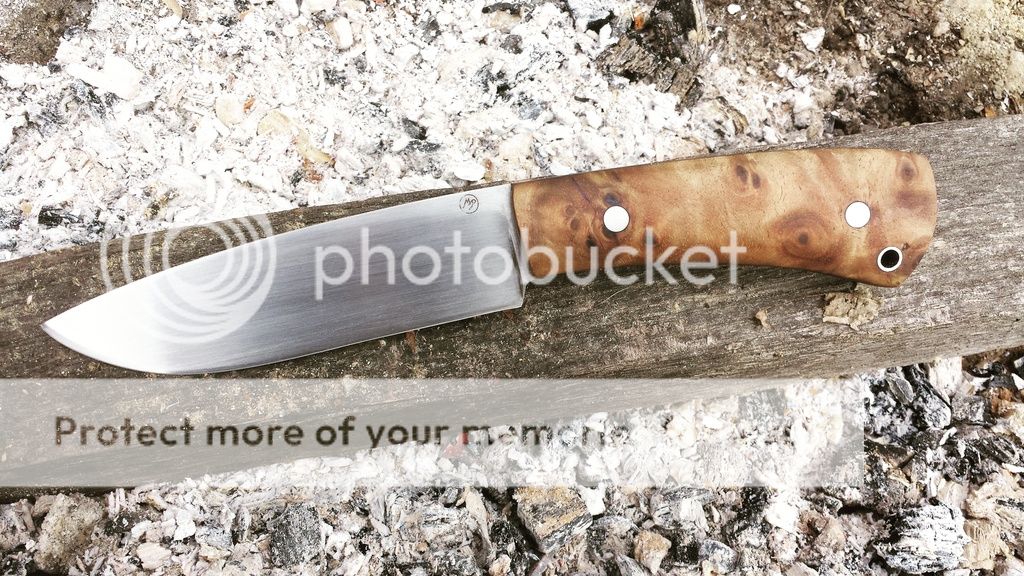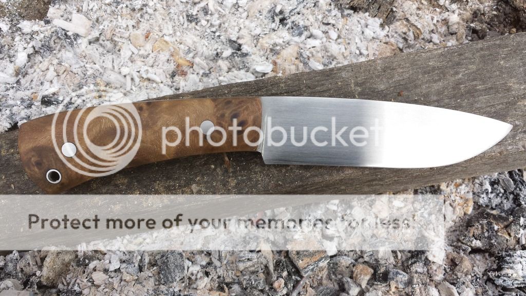 Here's a camp knife forged from 52100 that is just under 3/16" thick. The blade is 4 3/4". Hand sanded to 400-grit. Flat ground with a thin convex edge that would be great for food prep yet still hefty enough for batoning and other camp activities. The handle is 4 1/4" with stabilized Thuya burl, stainless corby bolts and a stainless tube. It is unbelievable how light this knife is. It comes with a leather sheath, your choice right or left.
