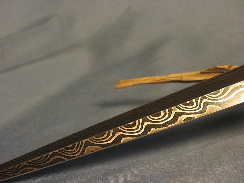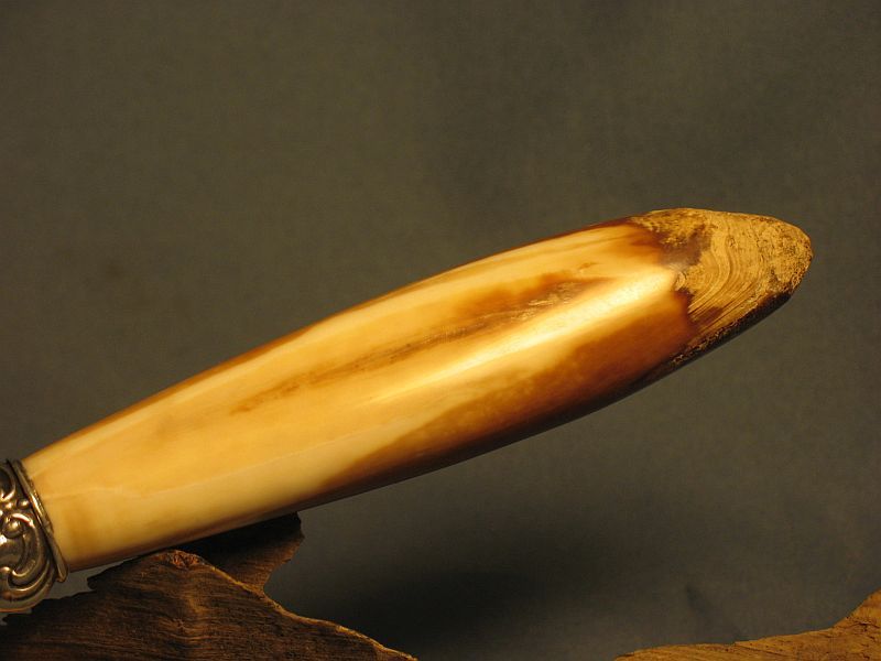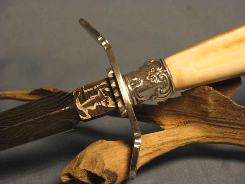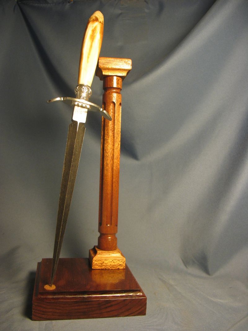 This is a big dagger with an artifact handle. The handle is a ancient artifact that was some sort of punch that was pointy and I left the other end natural. It is fossil walrus ivory. The handle was dug from private native lands by Inuit Indians on St. Lawrence Island off of Alaska. I did very little shaping on the handle and just polished except the end and it is how it came out of the ground. Fittings are nickel silver and sterling ferrule. I made the Damascus out of 1080 and 15n20 steel for the blade. The dagger is ground from 0.28 thick billet and the Blade length is 9 7/8 inches inches long and overall length is 14 1/4 inches. The stand is made from 3 different types of mahogany. The dagger is sharp and VERY pointy. This is one of my finer pieces.I am asking is "SOLD" and 15.00 for mail in USA address . My paypal is dangraves4923@earthlink.net Thanks and enjoy the photo's.