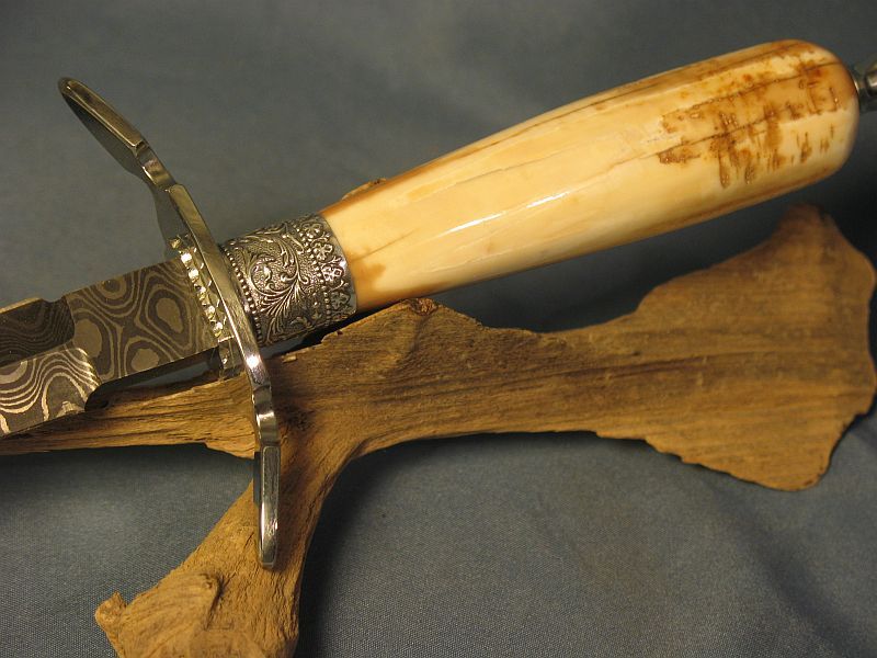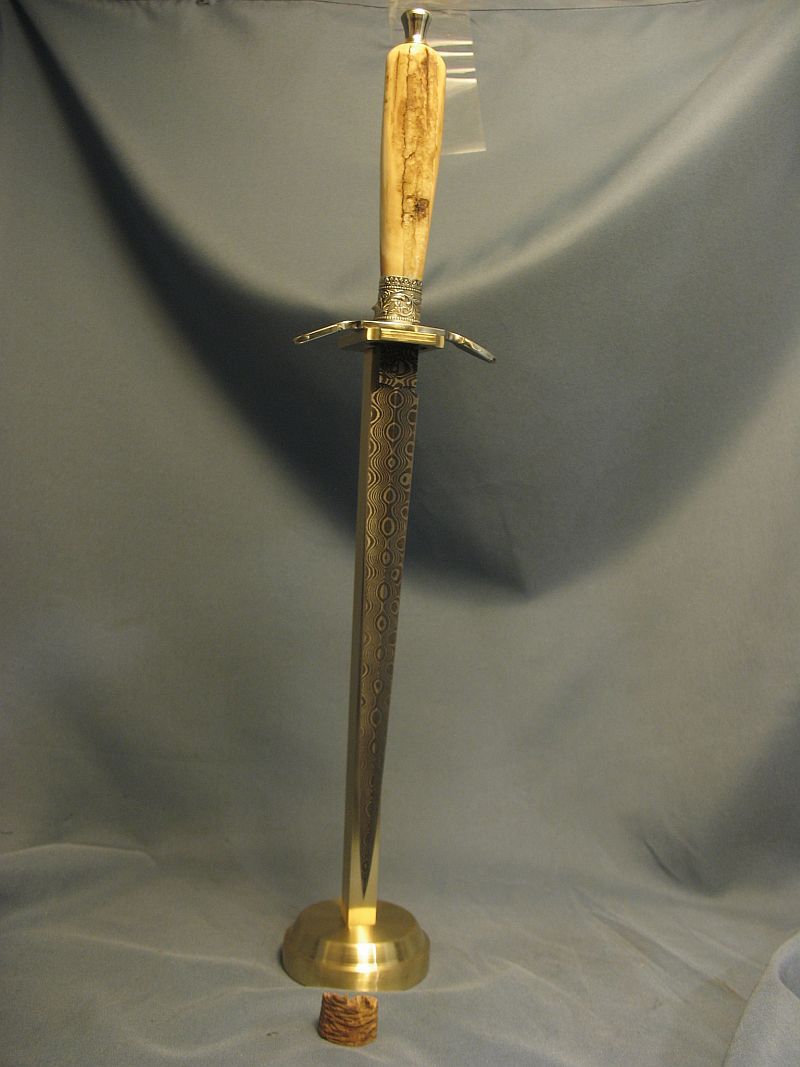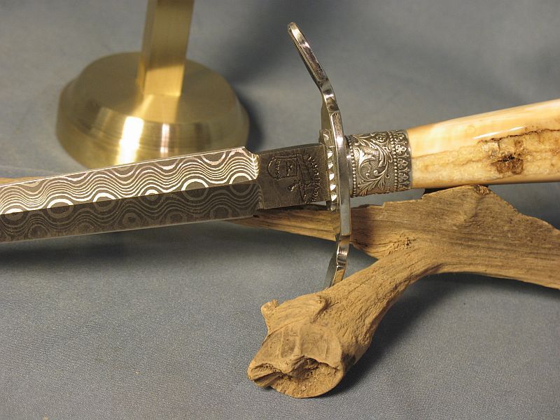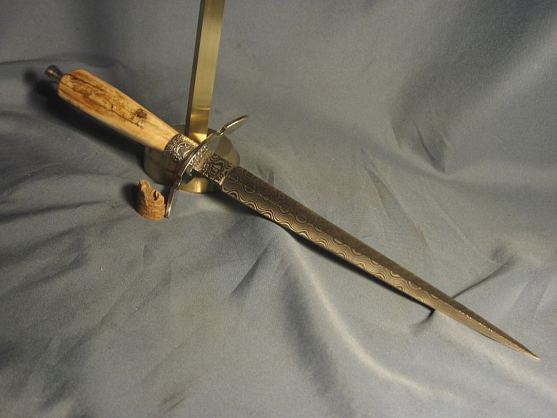 This is another bigger dagger than I usually build and the artifact handle called for it. The handle is a ancient artifact that is a ice tester and the other end was something else and I don't know as it was broke off. The end of the handle is where it broke. thI cut the end and it is in the picture and comes with the dagger. The other end was a blunt point and it is the one hidden by the ferrule. Of course I ground it off the make the dagger. It is fossil walrus ivory. The handle was dug from private native lands by Inuit Indians on St. Lawrence Island off of Alaska. I did a little shaping on the end. Fittings are nickel silver and sterling. I made the Ladder pattern Damascus out of 1080 and 15n20 steel for the blade. The dagger is ground from 1/4" thick billet and the Blade length is 9 inches inches long and overall length is 14 1/8 inches. The stand is made from solid stock of brass. After machining and sanding to a fine brush finish I coated the brass with a lacquer that prevents tarnish. It is heavy. The dagger is sharp and VERY pointy. This is one of my finer pieces. The set is "SOLD" and 15.00 for mail in USA address . My paypal is dangraves4923@earthlink.net Thanks and enjoy the photo's.
