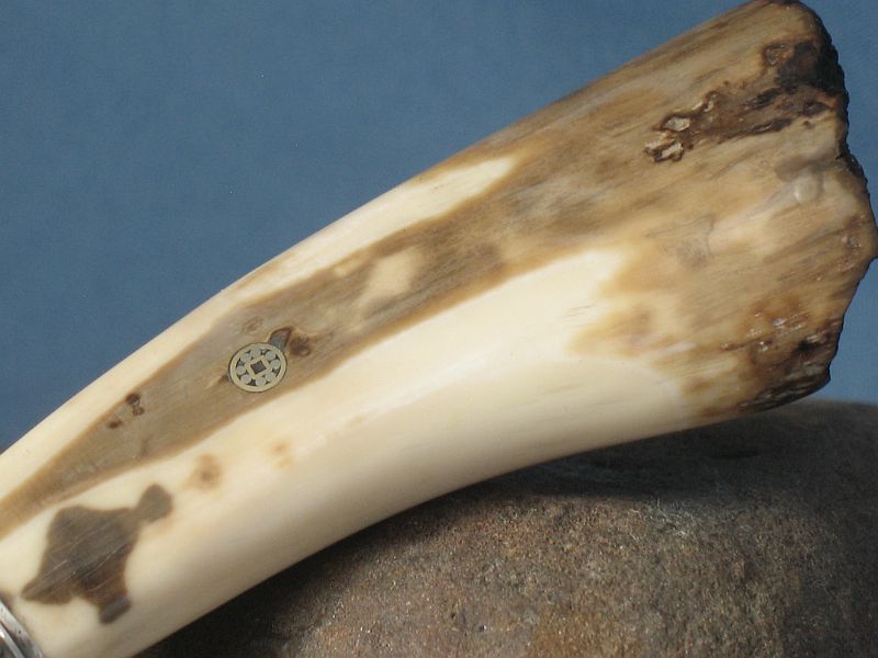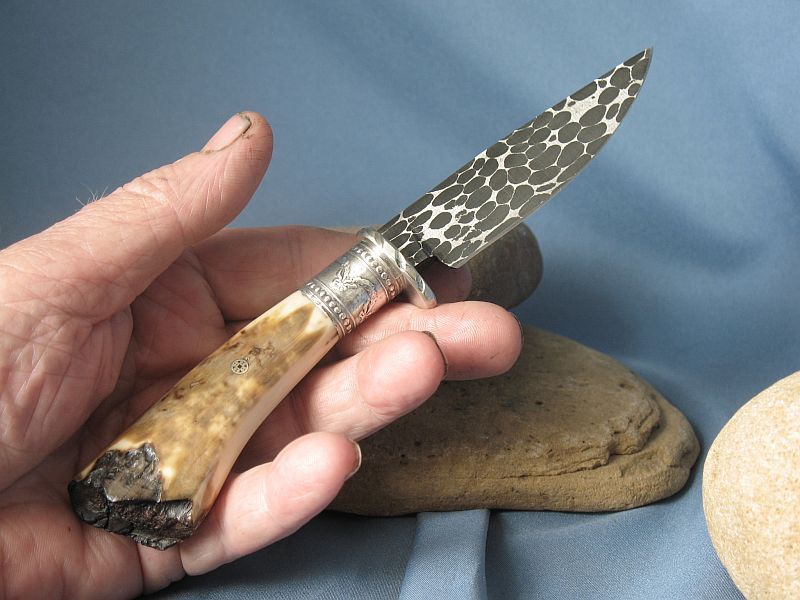 Hello folks. Here is a snake skin Damascus knife which is made out of ball bearings and 4800 KC steel. Makes for a hell of an edge holder so its not just about the looks. Ball bearings are very high carbon steel made to be tough. This one has a blade that is 3 3/4 inches and overall is 7 5/8 inches. The blade is a 1/4 inch thick at the guard and tapers to point. Nickel silver guard and mosiac pin and sterling ferrule. Very comfortable in the hand. The handle is fossil walrus ivory with end as it came out of the ground. and the sheath is included. Hope you like it as I enjoyed making it. It is "SOLD" plus 6.00 for priority mail. Cant ship to New York and New Jersey. My paypal is dangraves4923@earthlink.net