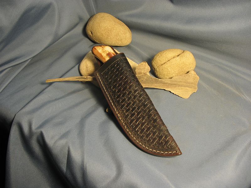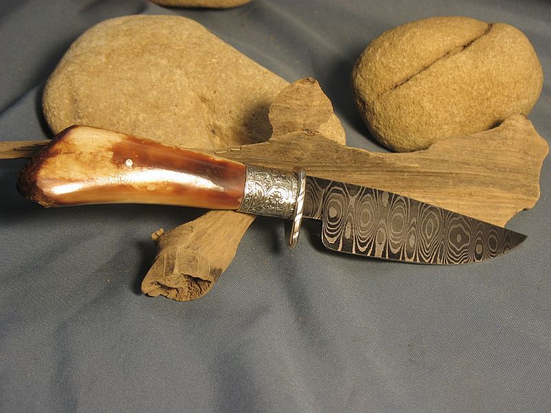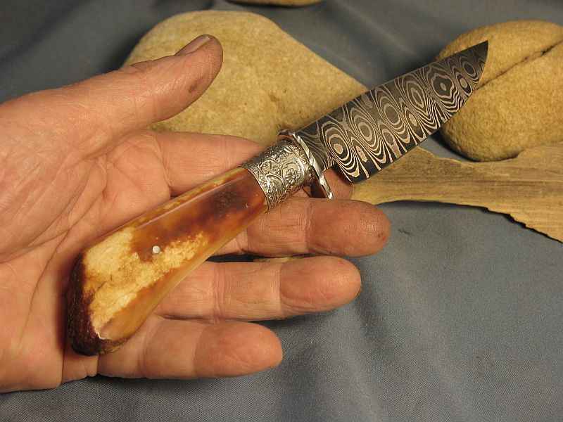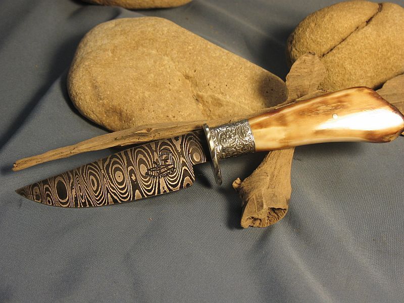 his is one I just completed of Fossil Walrus ivory , nickel silver, sterling silver ferrule and my Damascus of 1084 fine grain and 15n20. The handle is fossil walrus with natural end as it came out of the ground. Good for the left or right hand (fits very comfortable). SHARP! Blade length is 3 7/8 inches and overall length is 8 inches. Nice leather belt sheath. Any questions please ask.