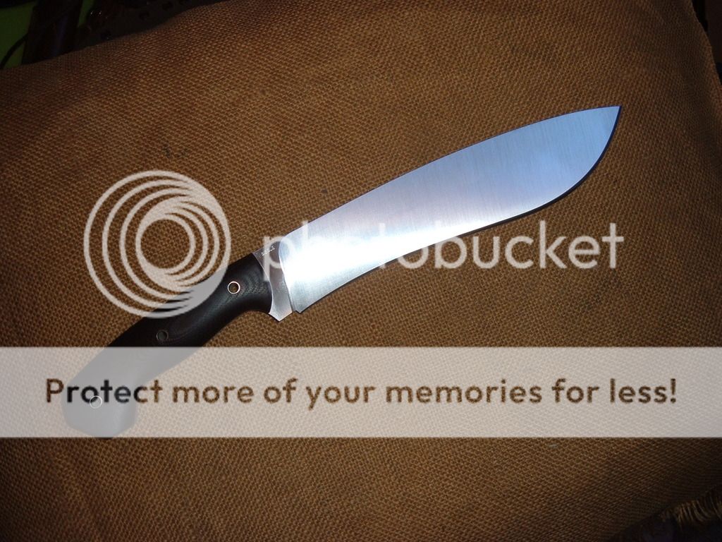 This is a new recurve pattern that I really like. It is very useful around camp. These are made from 1/4in thick 5160 and deferentially hardened. Overall they are 14 3/4in long with 9 1/2in blades tip to handle. I have four available in OD Green G10, natural linen micarta, and black G10. One of the black G10 has a textured handle surface for a very nice non slip grip. They will all come with a black Kydex sheath set up for a large Tek Lok(not included). Price for each one is $350 shipped in the US.