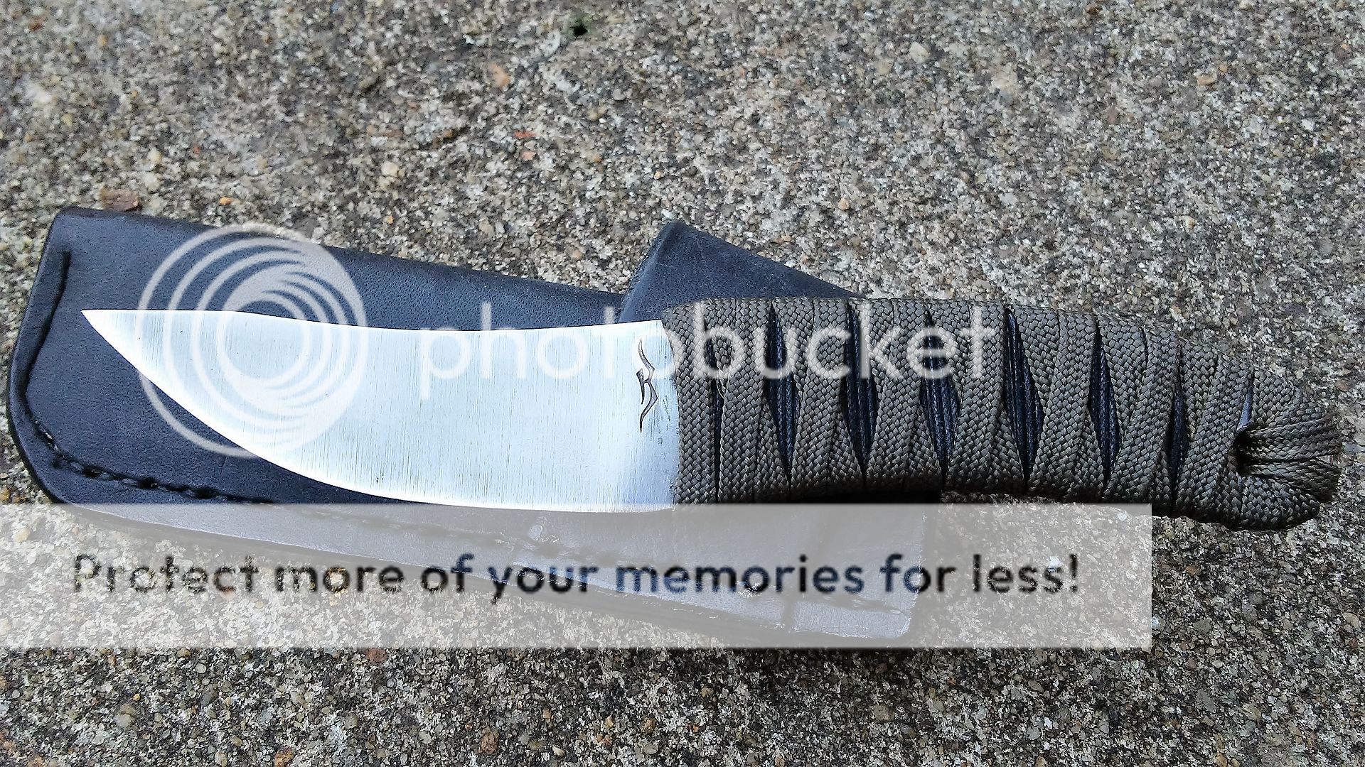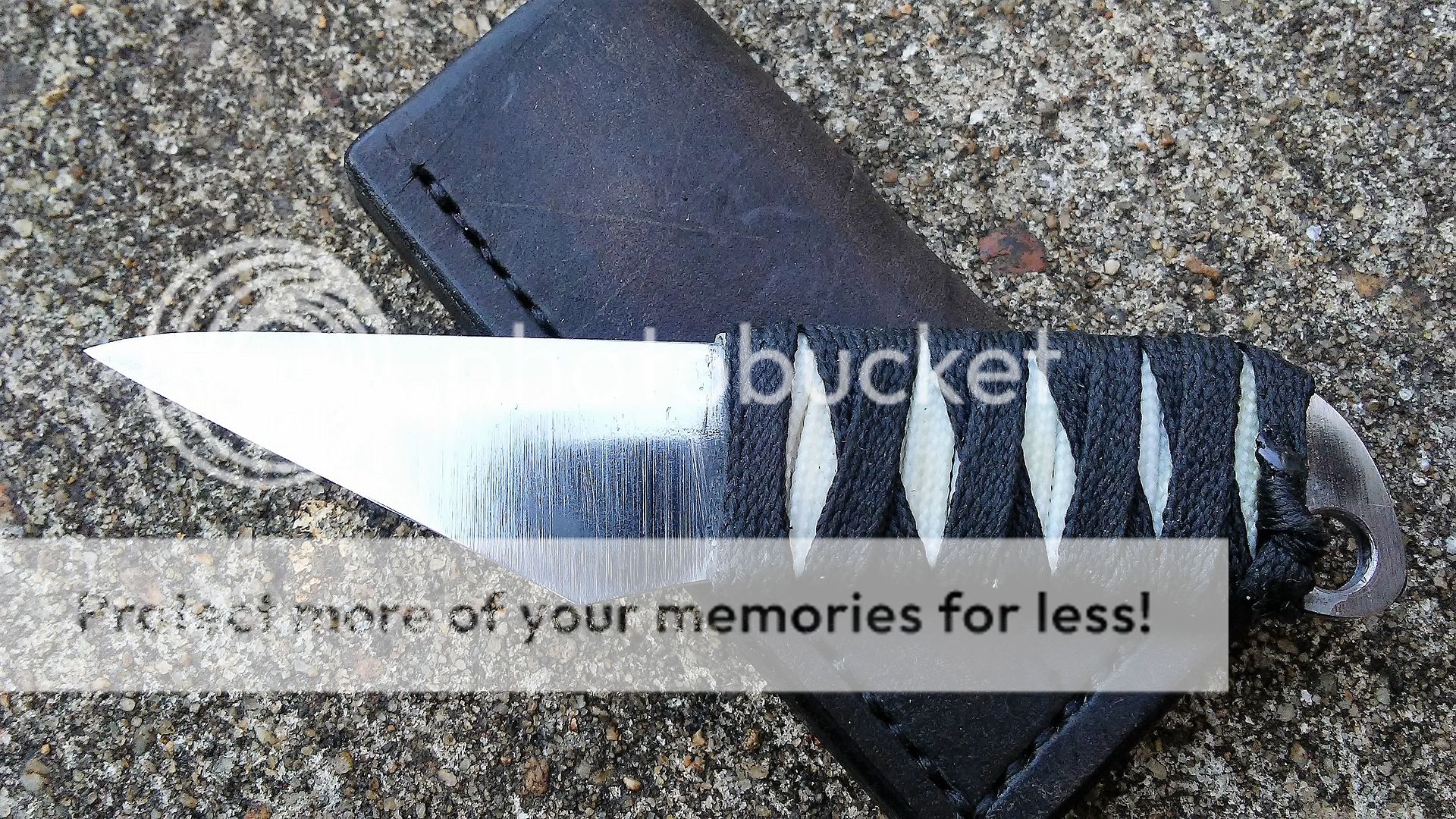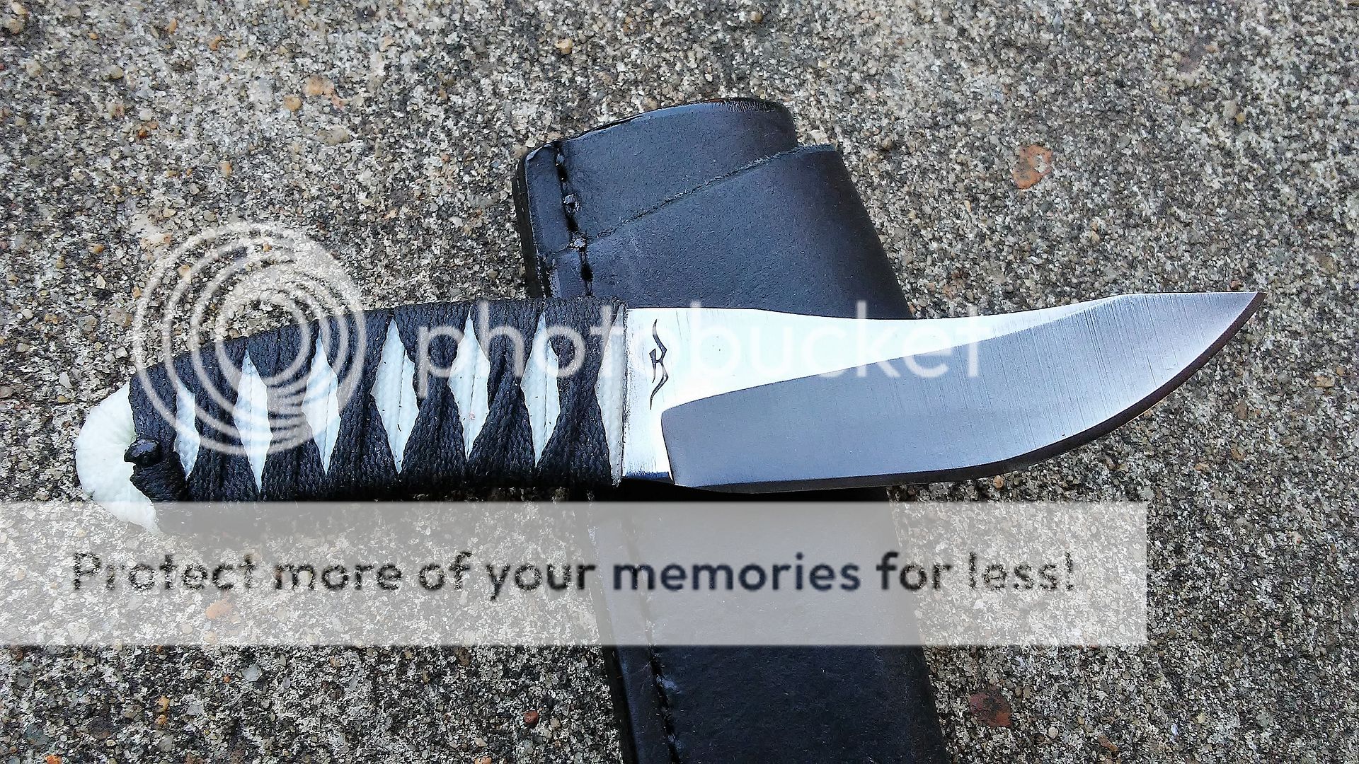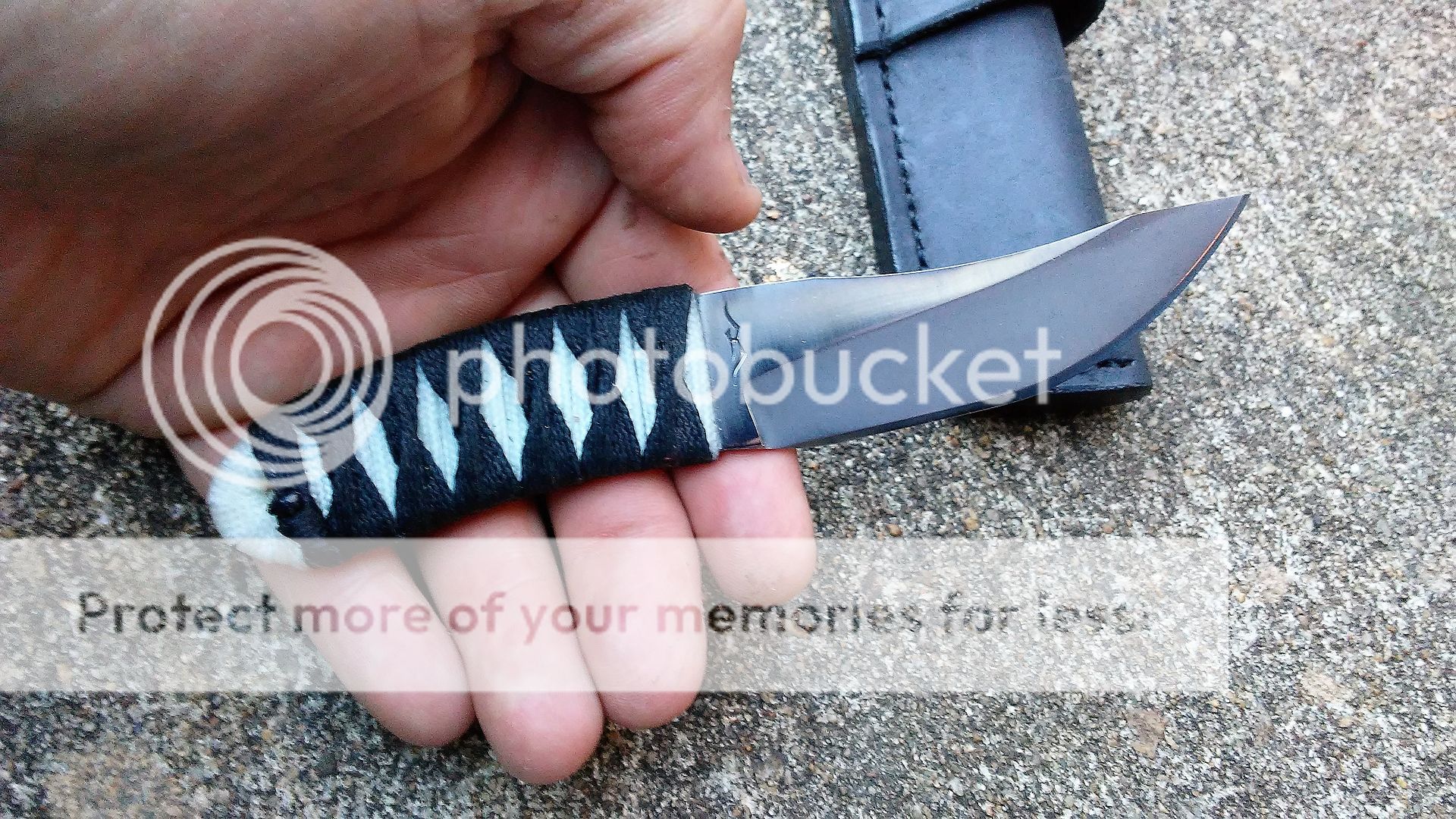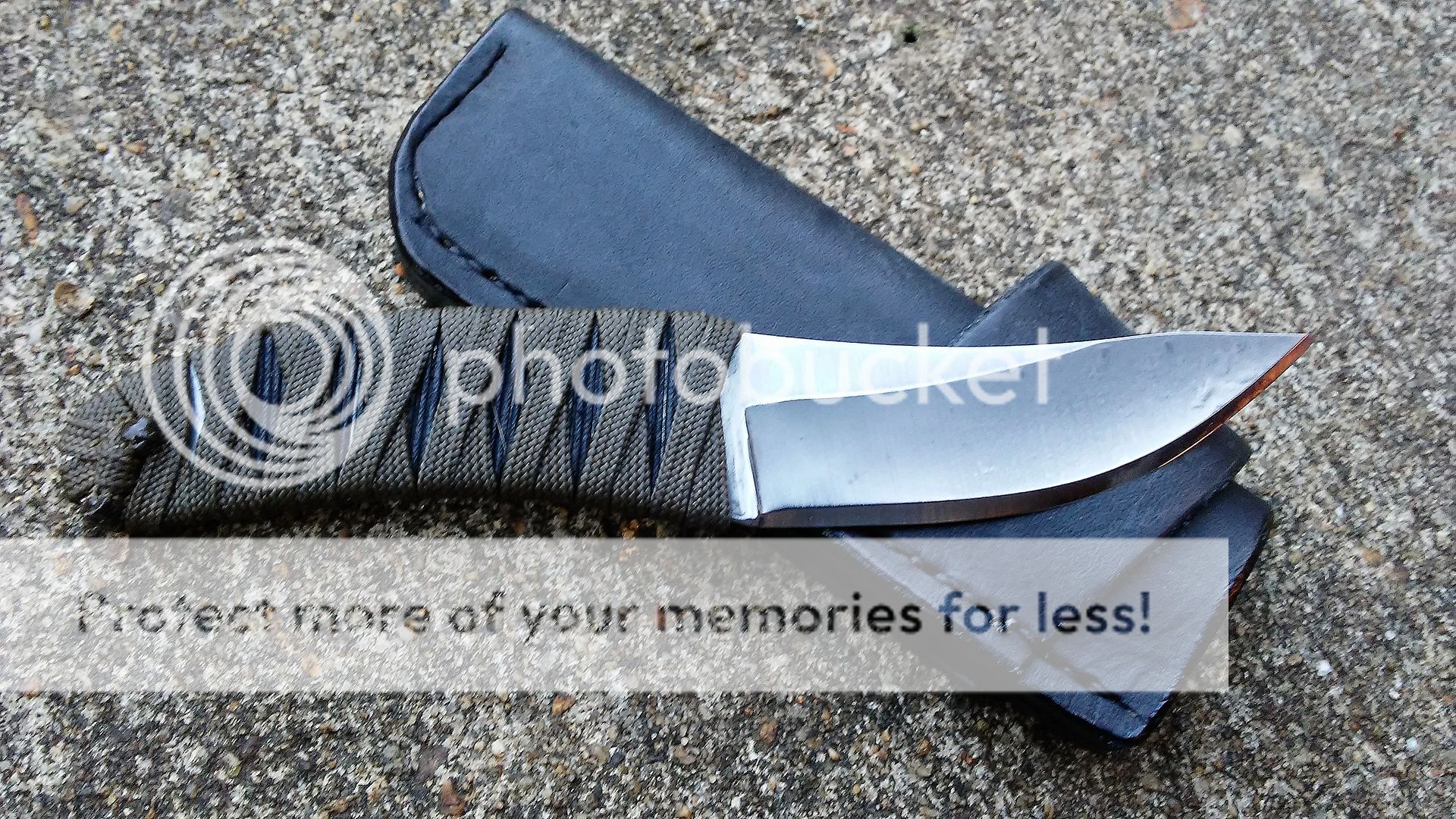 #2. 6 3/8in long X 3/32in thick X 1in wide at the widest. Handle 3 1/4in. Made from 15N20 carbon steel. It's ground with a right side hollow chisel grind and the handle is wrapped with black cotton cord and white paracord that was soaked in resin. Comes with a black leather belt sheath. [SOLD[/COLOR]
