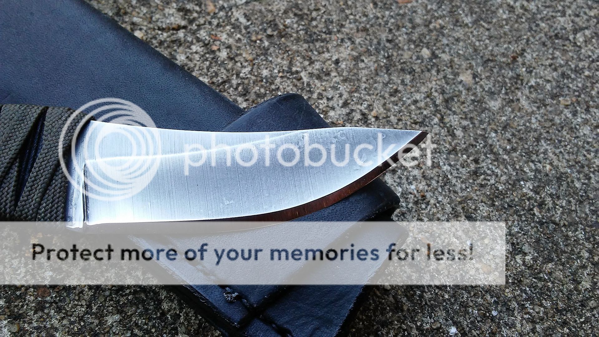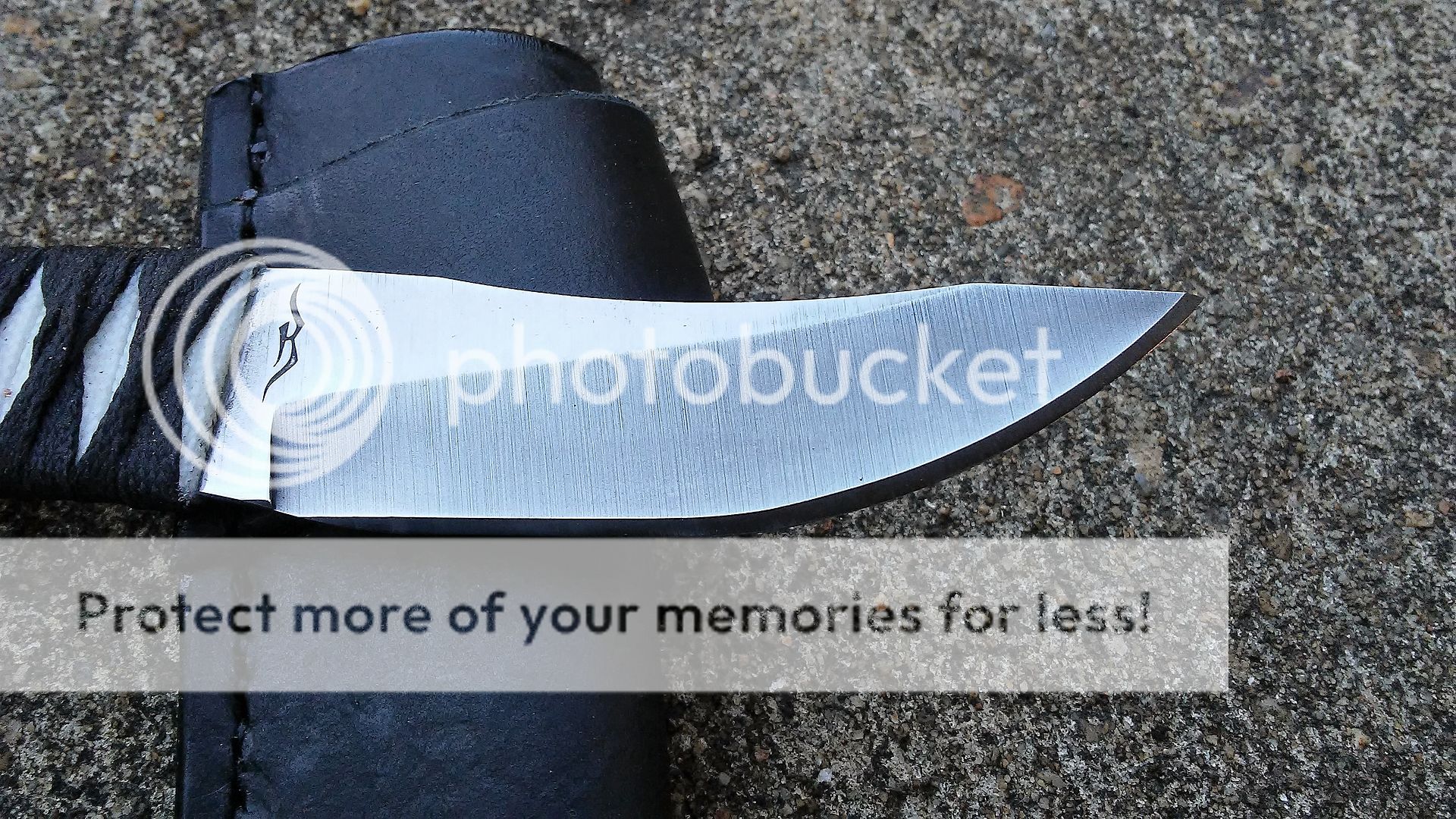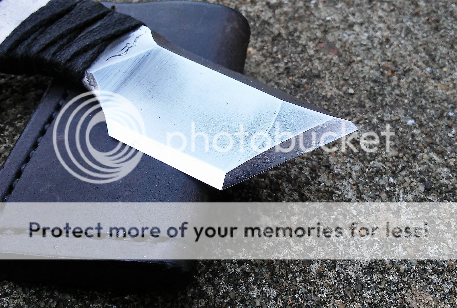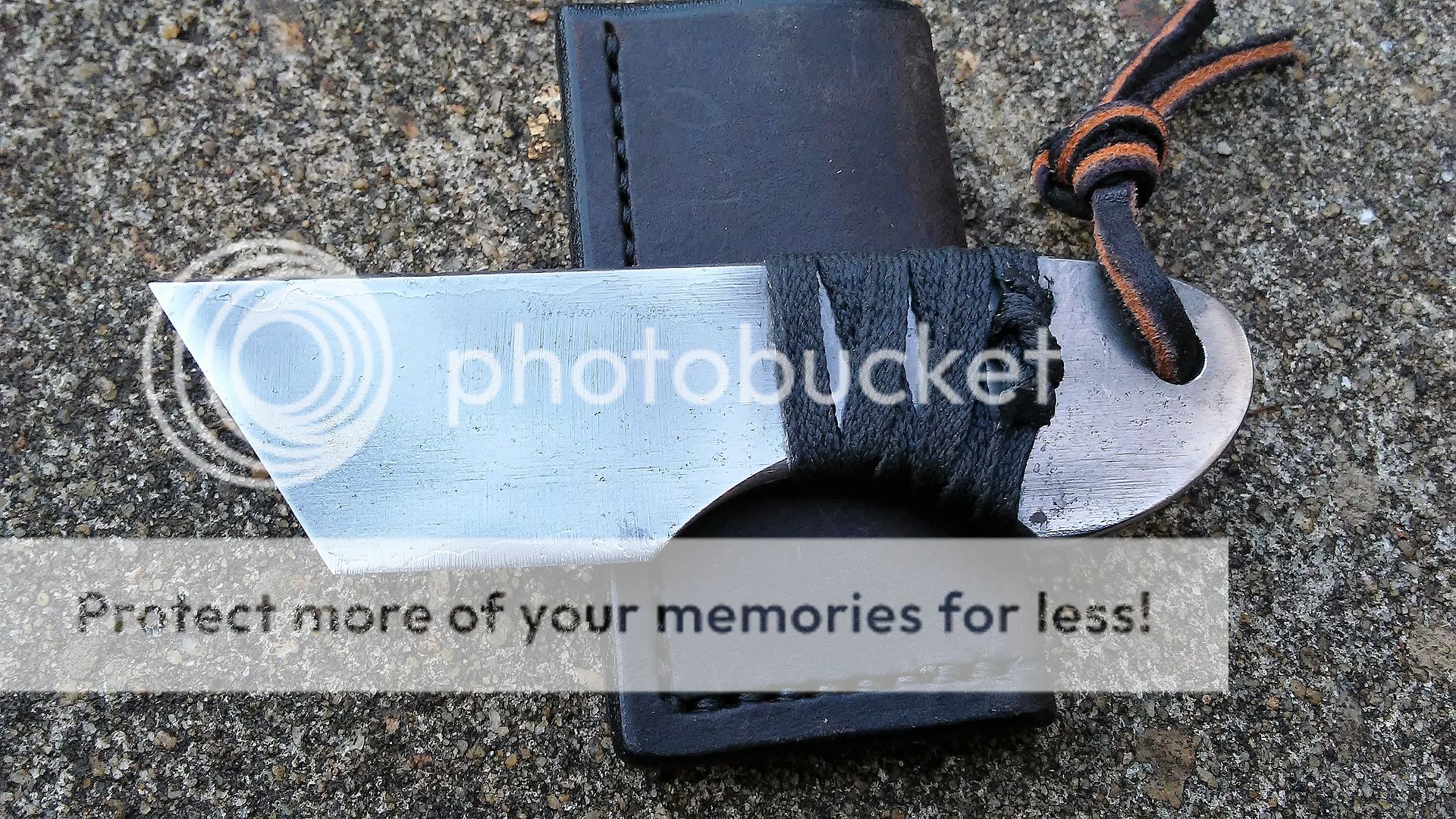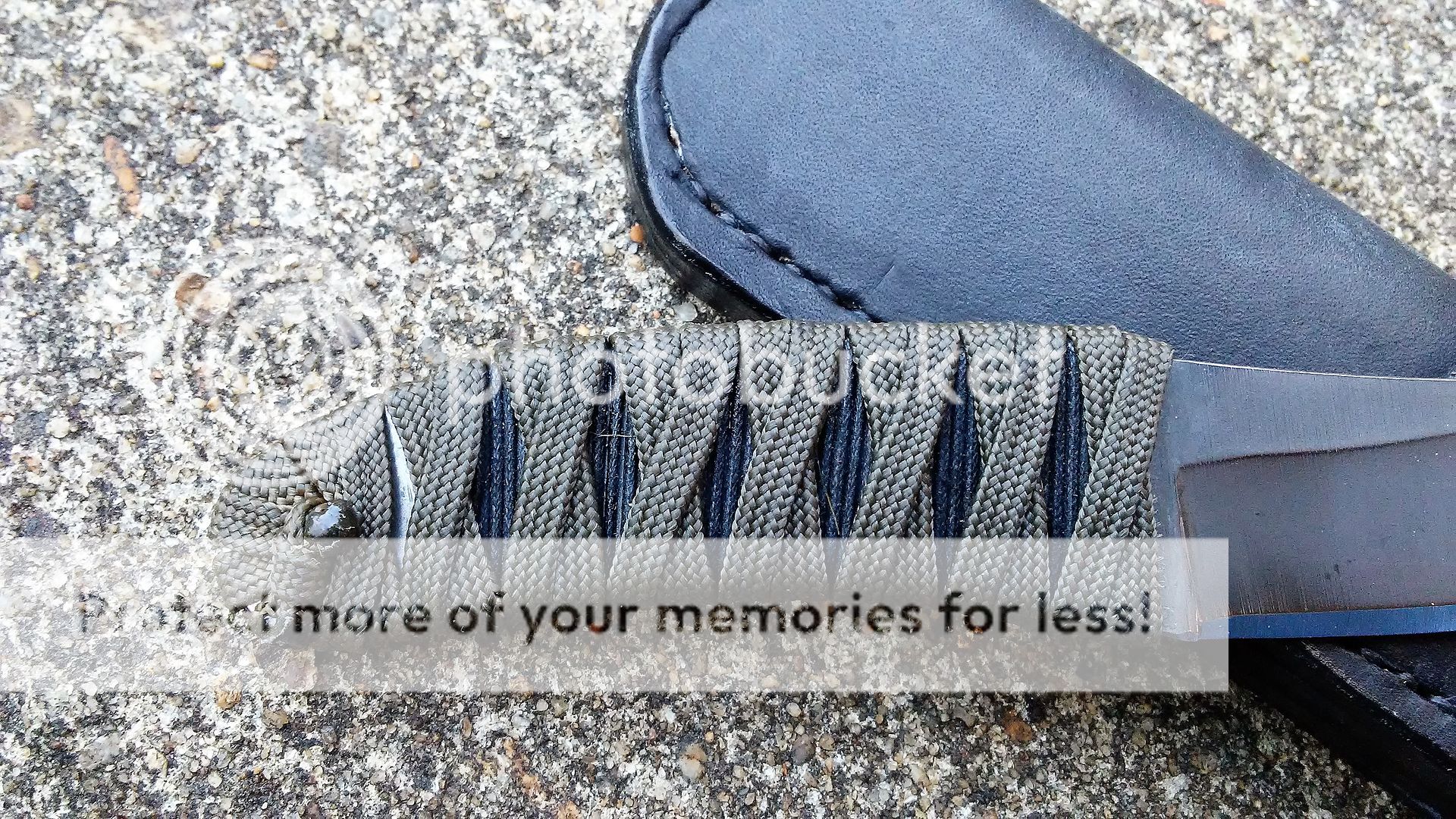 #2. 6 3/8in long X 3/32in thick X 1in wide at the widest. Handle 3 1/4in. Made from 15N20 carbon steel. It's ground with a right side hollow chisel grind and the handle is wrapped with black cotton cord and white paracord that was soaked in resin. Comes with a black leather belt sheath. [SOLD[/COLOR]