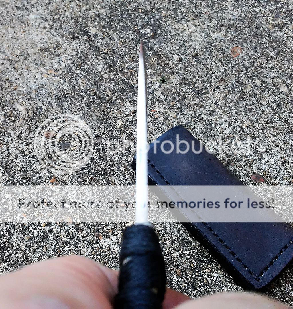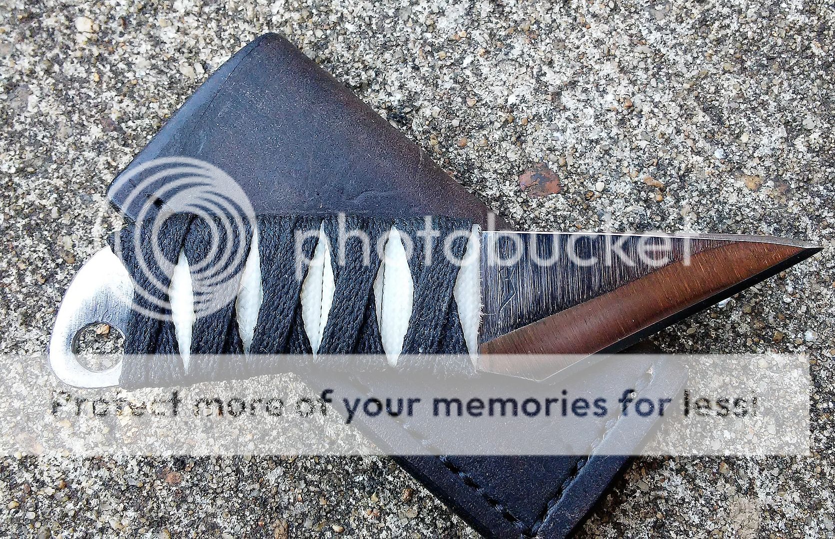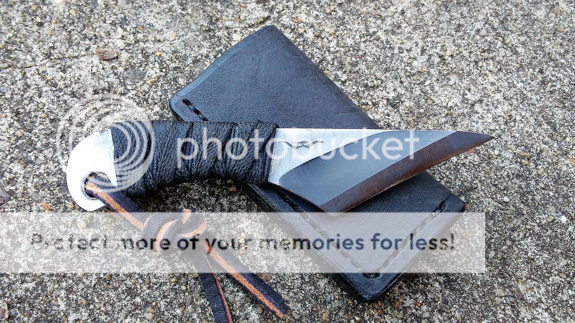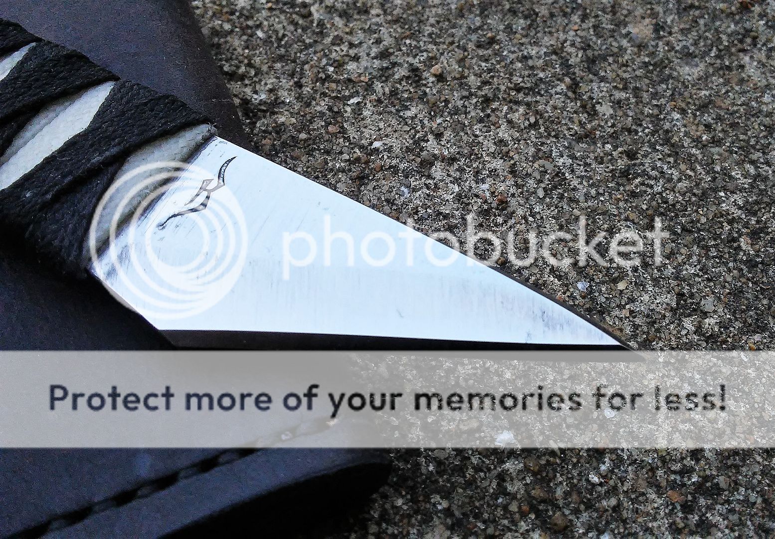 #2. 6 3/8in long X 3/32in thick X 1in wide at the widest. Handle 3 1/4in. Made from 15N20 carbon steel. It's ground with a right side hollow chisel grind and the handle is wrapped with black cotton cord and white paracord that was soaked in resin. Comes with a black leather belt sheath. [SOLD[/COLOR]