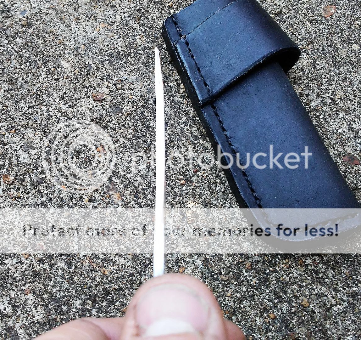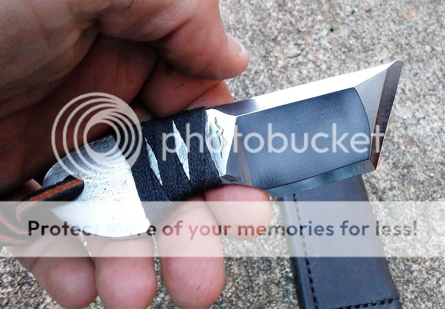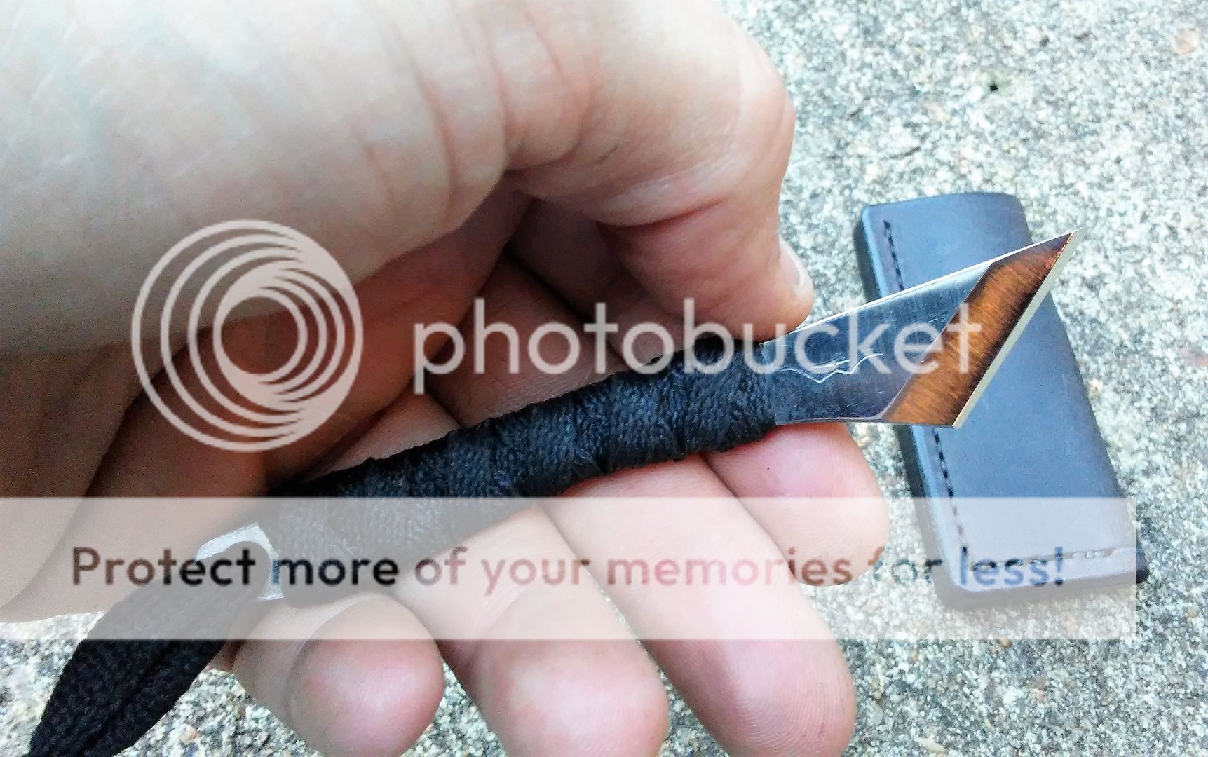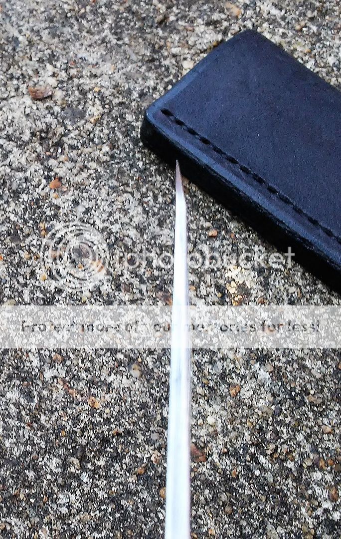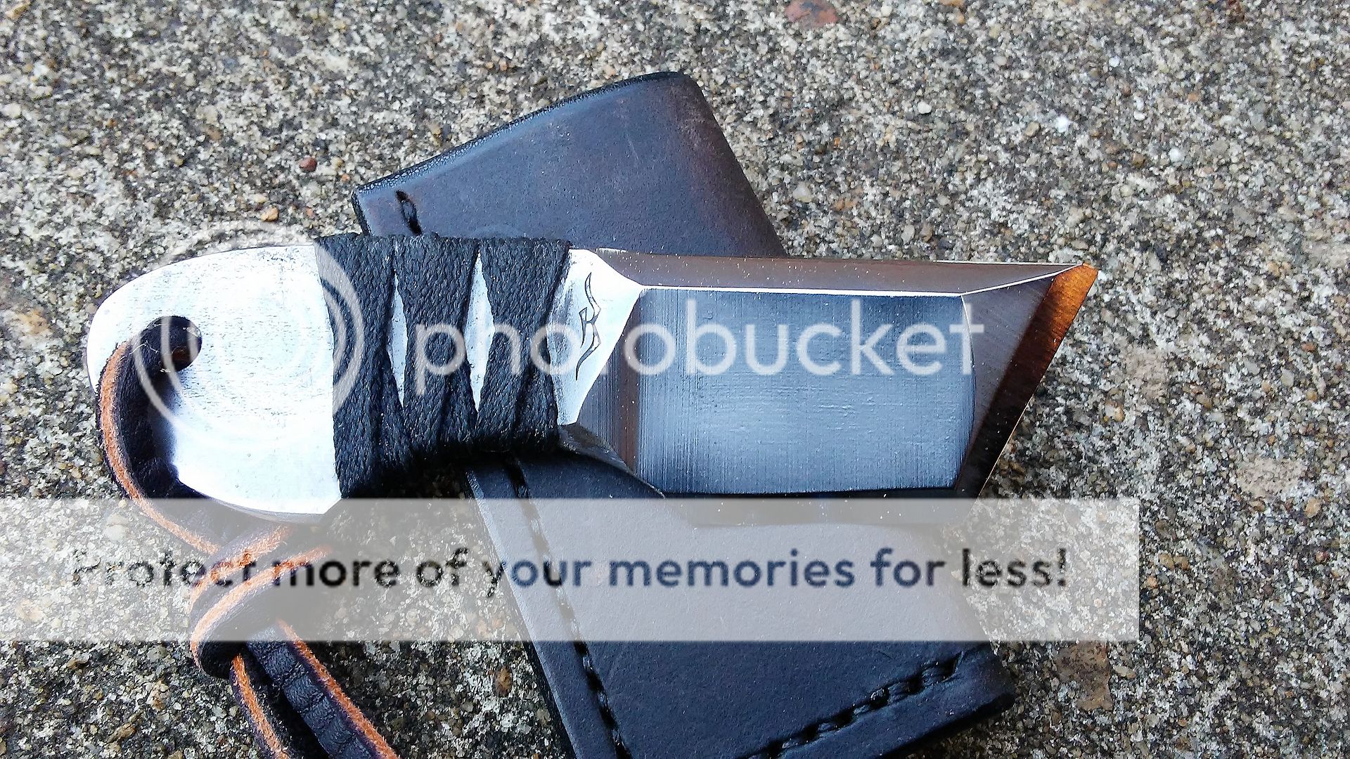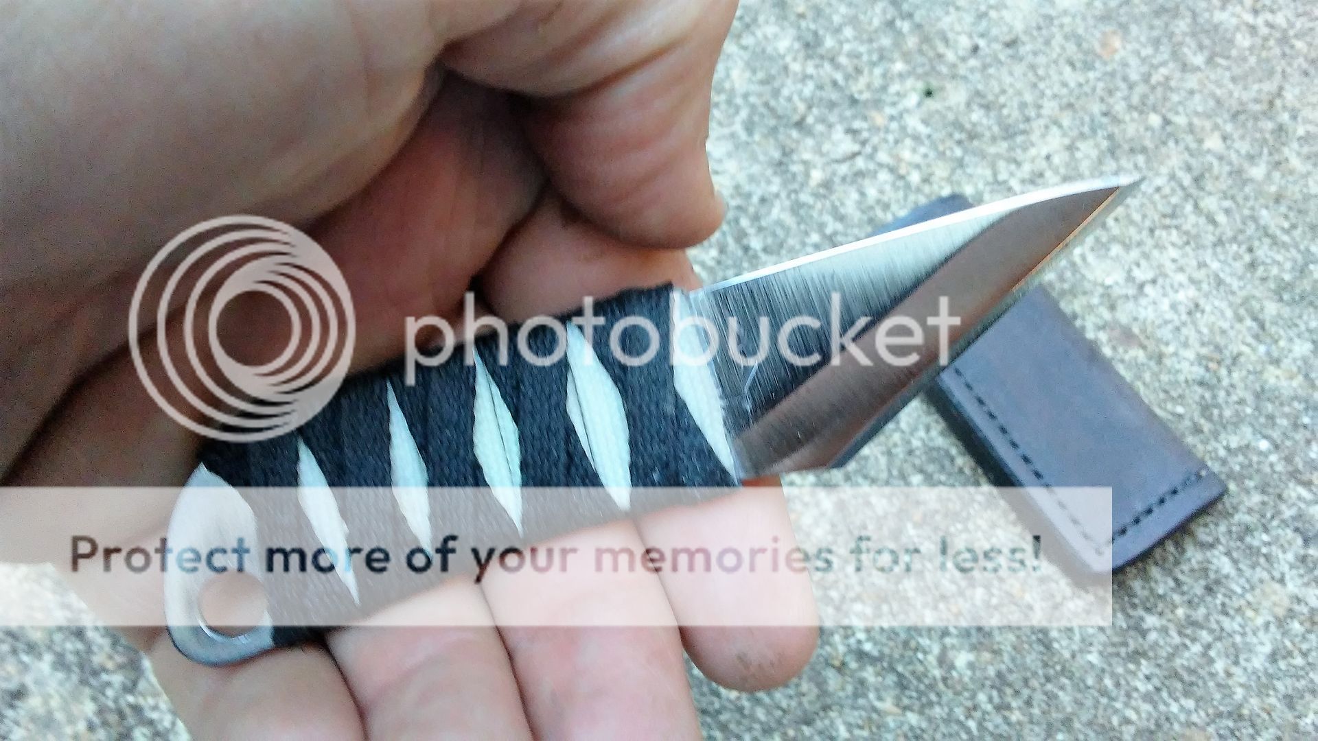 #2. 6 3/8in long X 3/32in thick X 1in wide at the widest. Handle 3 1/4in. Made from 15N20 carbon steel. It's ground with a right side hollow chisel grind and the handle is wrapped with black cotton cord and white paracord that was soaked in resin. Comes with a black leather belt sheath. [SOLD[/COLOR]