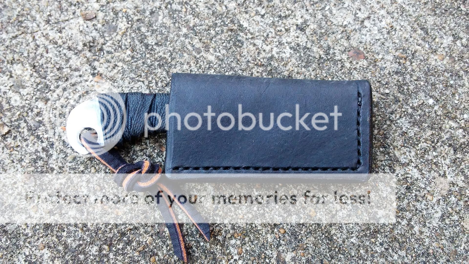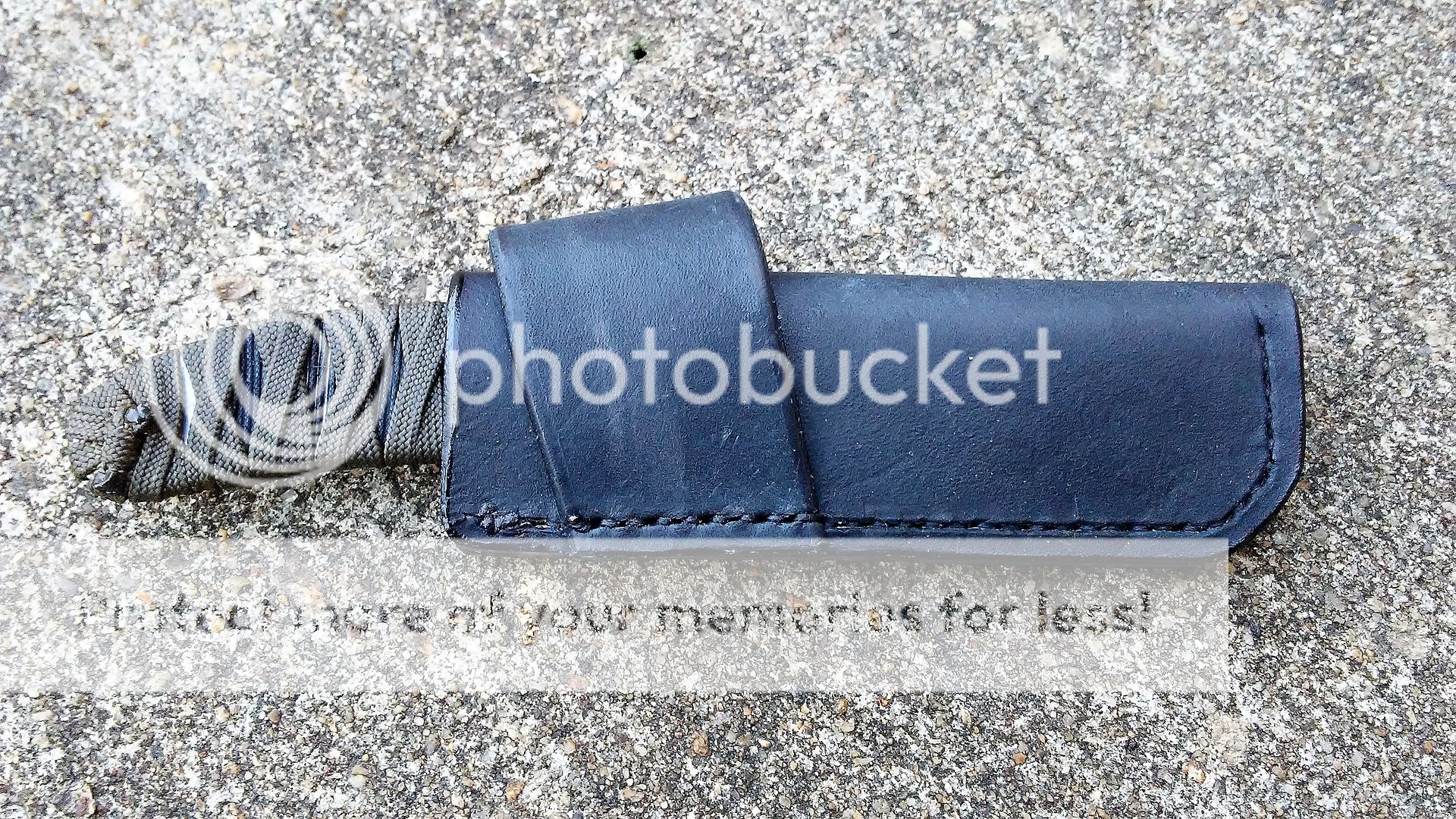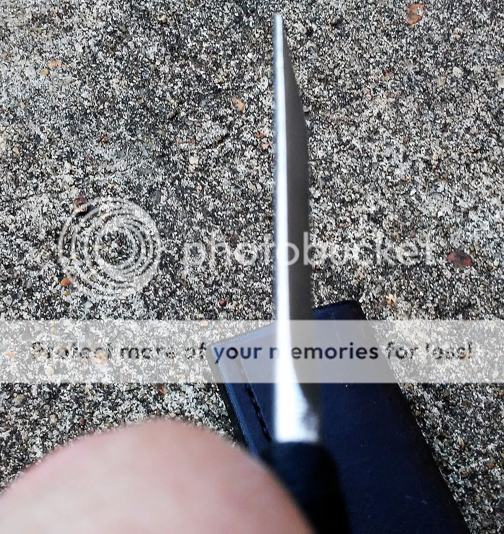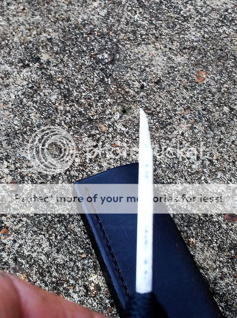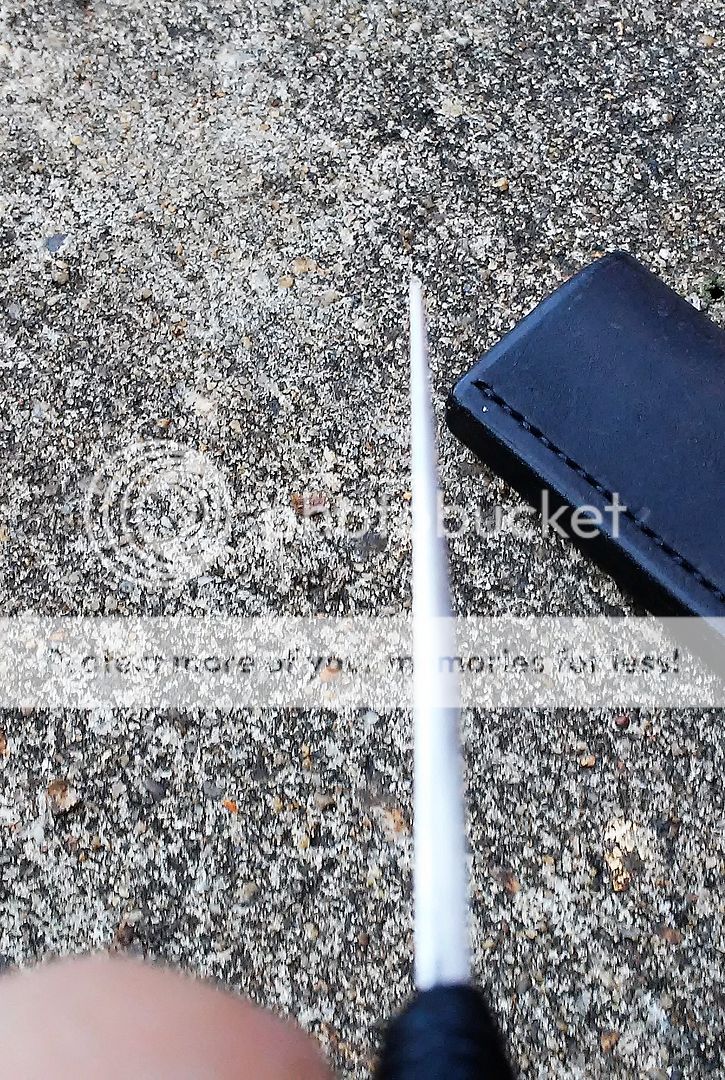#2. 6 3/8in long X 3/32in thick X 1in wide at the widest. Handle 3 1/4in. Made from 15N20 carbon steel. It's ground with a right side hollow chisel grind and the handle is wrapped with black cotton cord and white paracord that was soaked in resin. Comes with a black leather belt sheath. [SOLD[/COLOR]