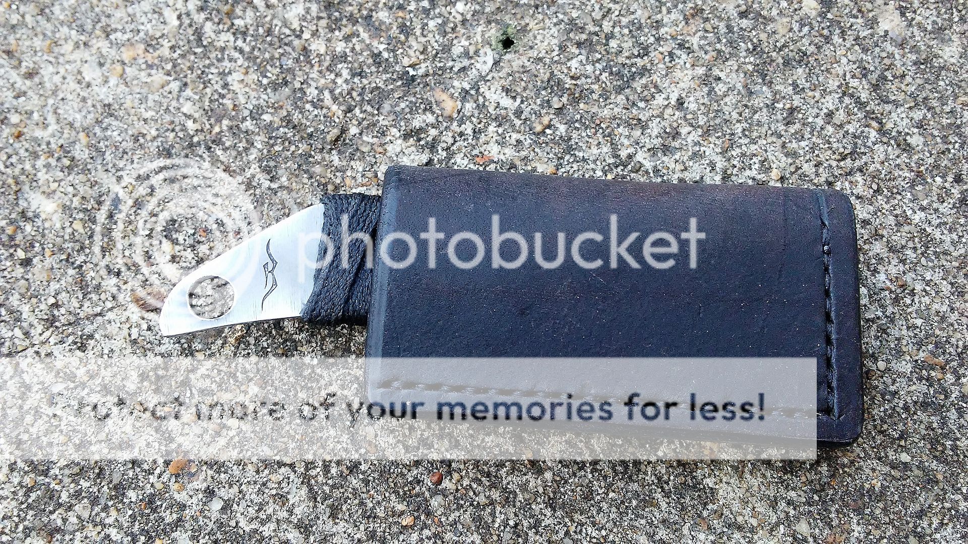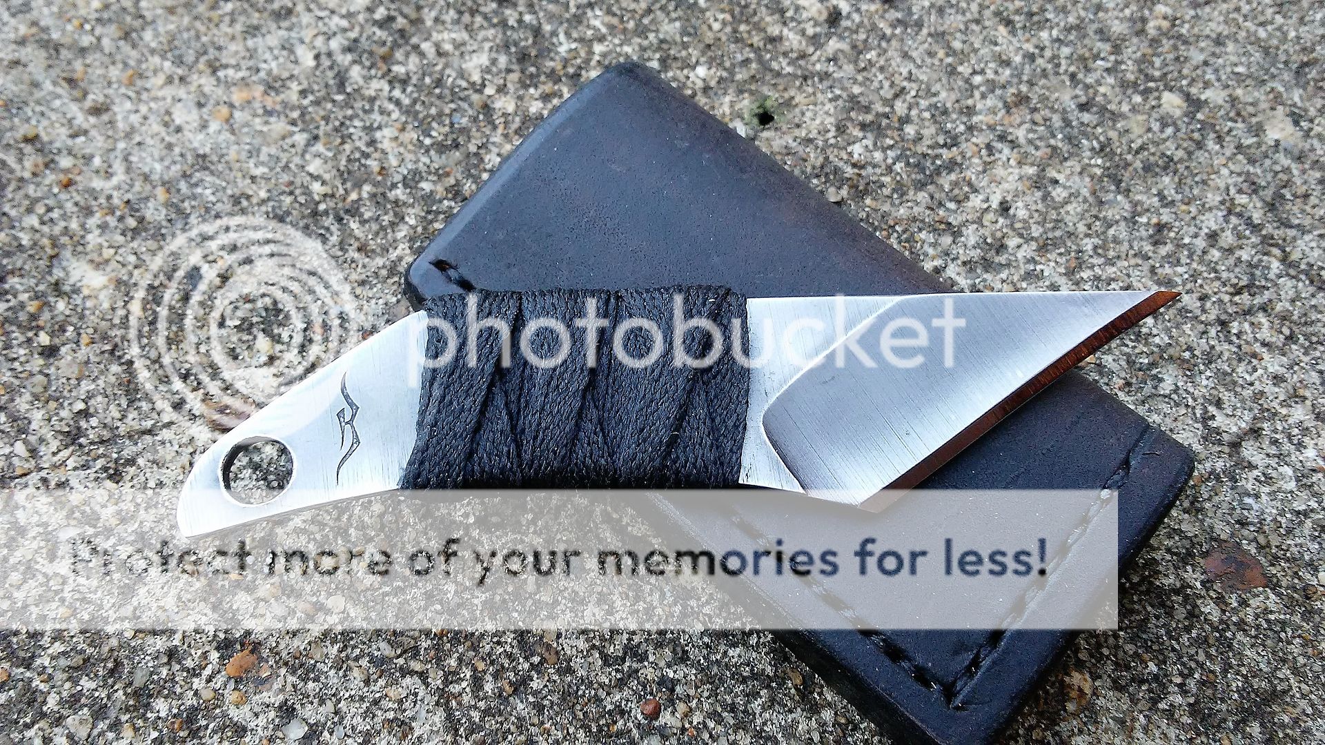#3. 4 1/2in long X 3/32in thick X 1in wide at the widest. Cutting Edge 1 3/4in long. Made from 15N20 carbon steel. It's ground with a right side hollow chisel grind and the handle is wrapped with black cotton cord that was soaked in resin. Comes with a black leather pocket sheath. SOLD.