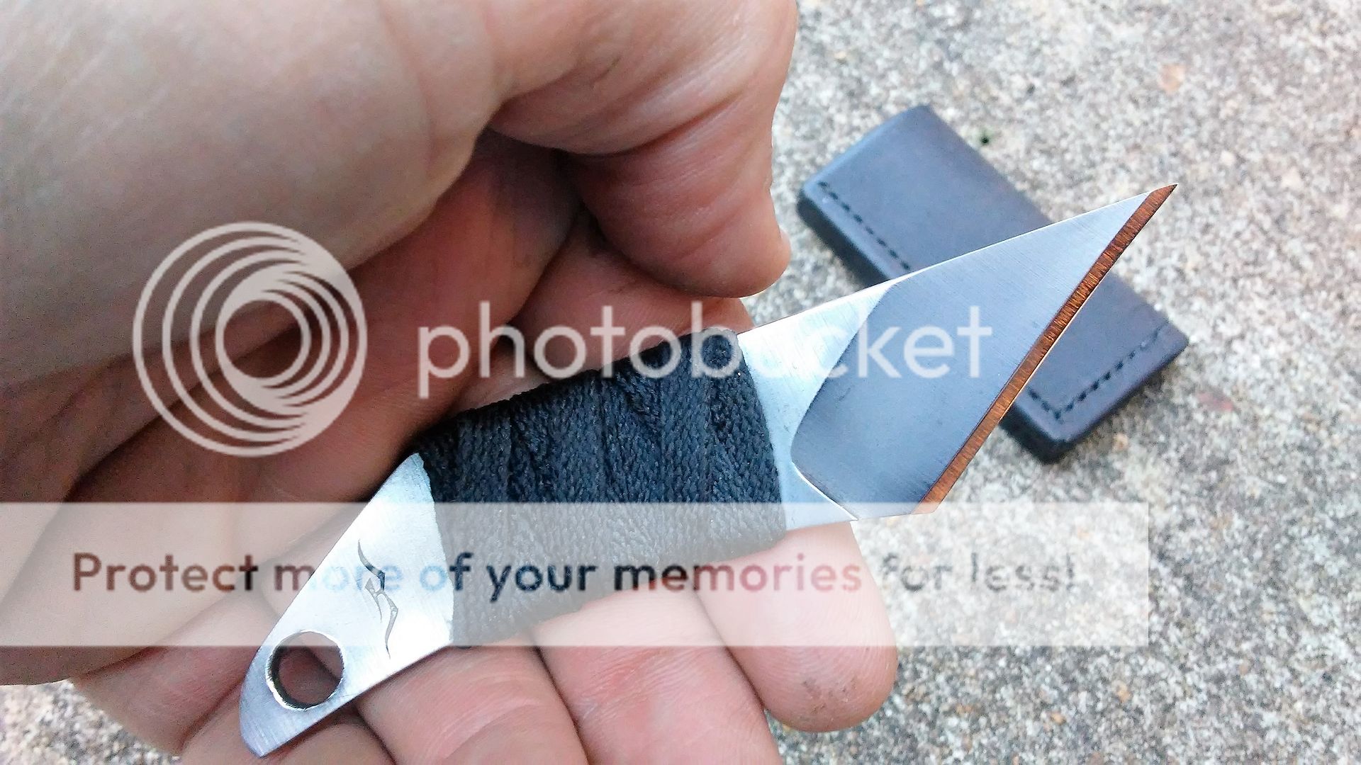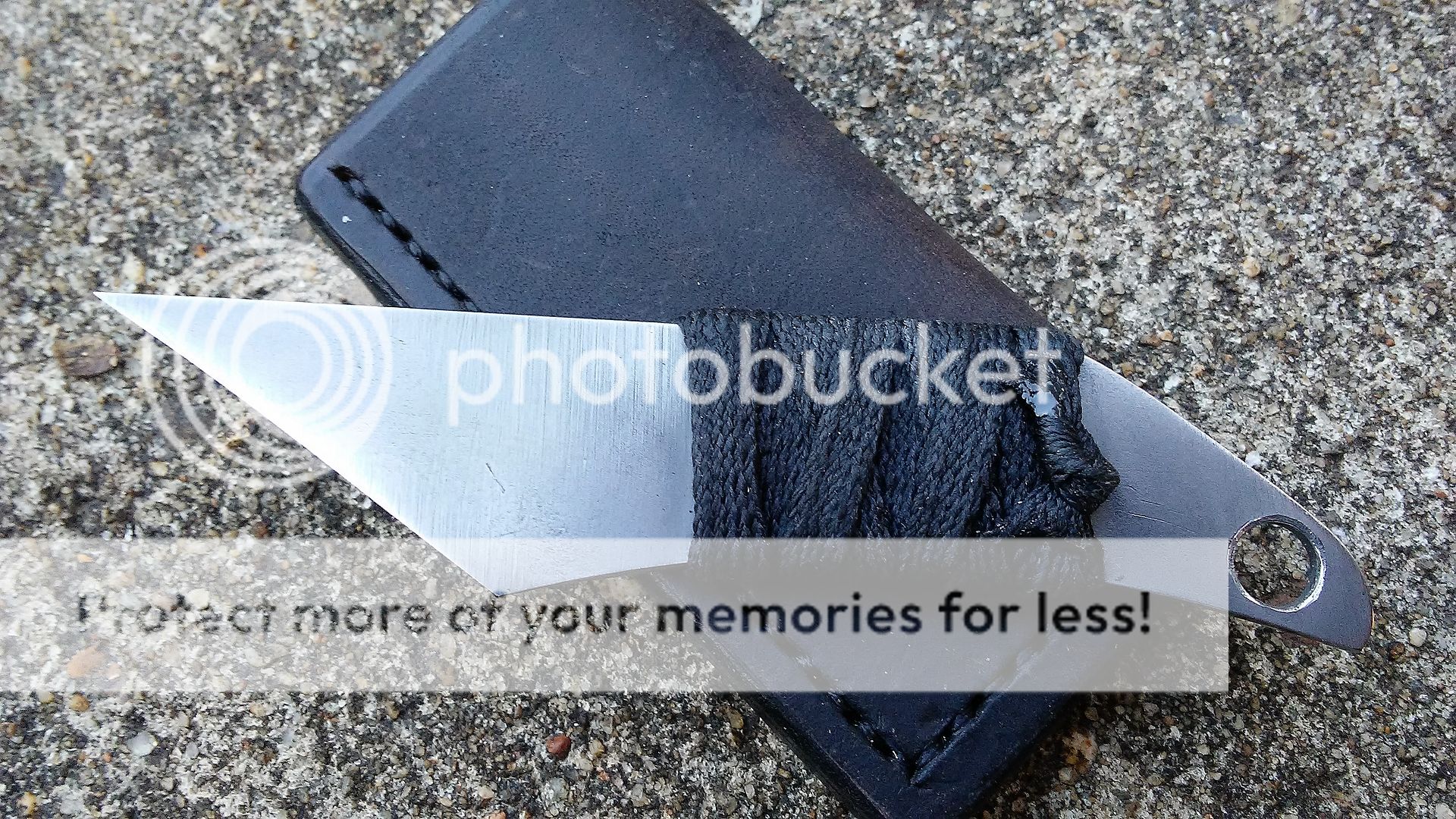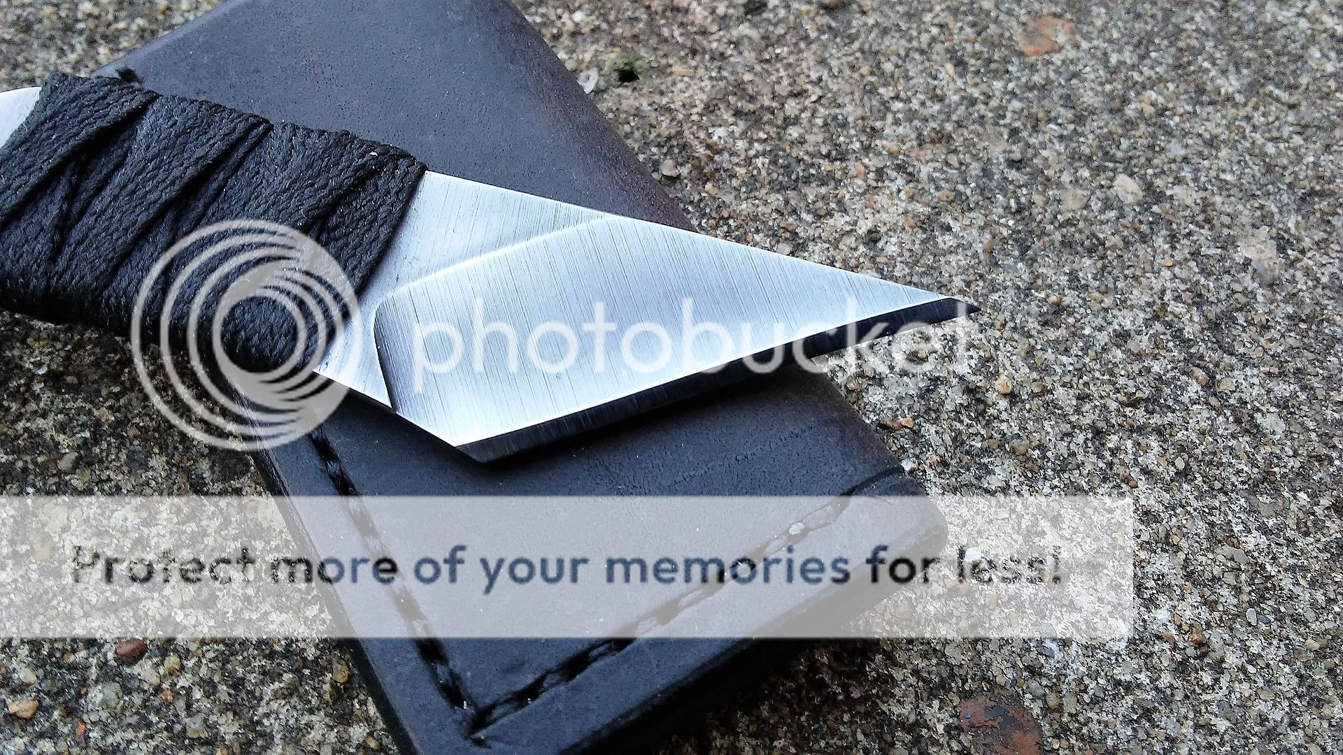 #1. 4 1/2in long X 1/8in thick X 3/4in wide at the widest. Cutting Edge 1 1/8in long. Made from 1095 carbon steel. It's ground with a right side flat chisel grind and the handle is wrapped with black cotton cord that was soaked in resin. Comes with a black leather pocket sheath. SOLD
