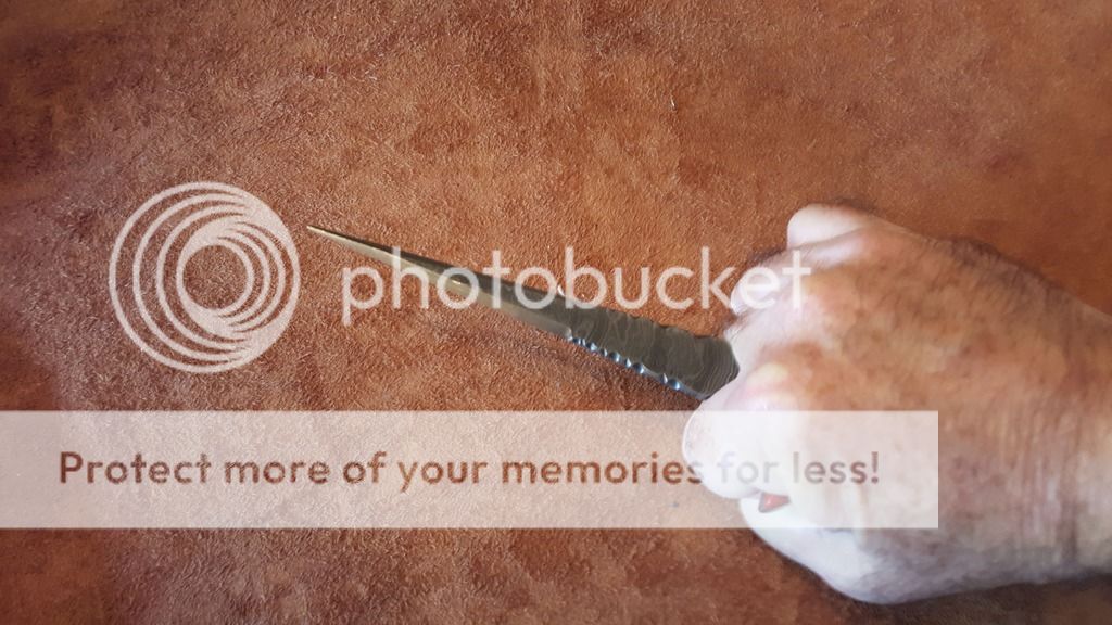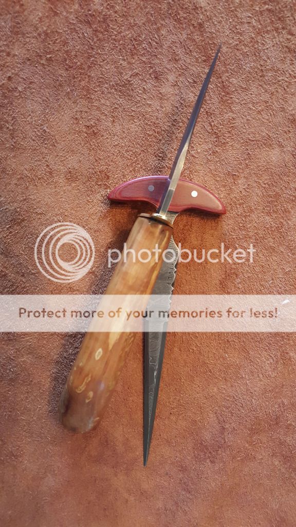 Red Linen Micarta scales, Stainless pins. Seven inches from tip to the back of the handle. Cutting edges are 3.5 inches long. Total blade length in front of the finger hollows is 5.25 inches. File work is the vine and thorns. Price is $175.00 plus shipping $7.50 USPS priority shipping with insurance. Add a lined (so it does not scratch the blade) Kydex belt or neck sheath $20.00 or a leather belt sheath for $30.00 you choice or make your own.