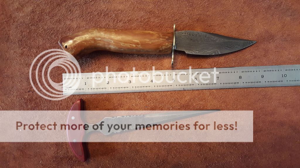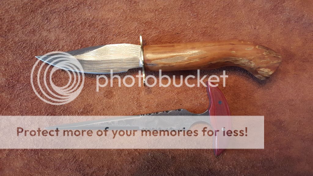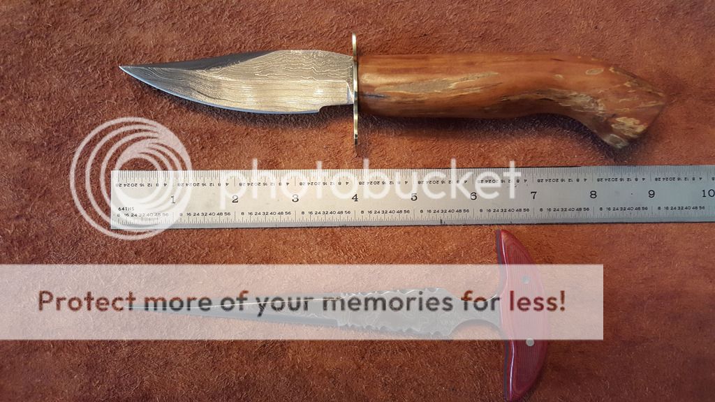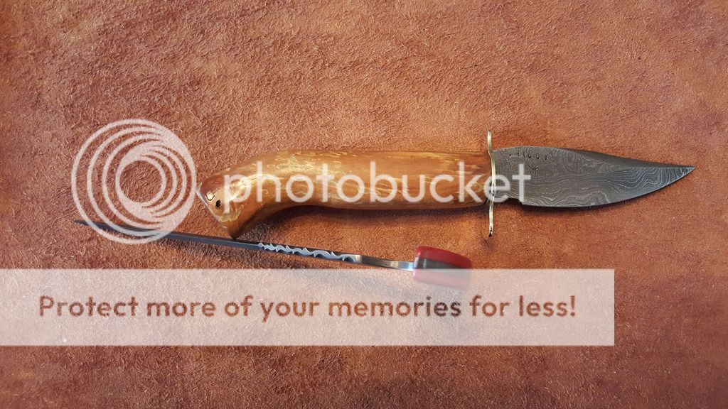 Spalted Apple wood handle with 3 coats of Tung oil,Brass Guard, Blade is just 3.75 inches long and the lower and upper swedge are both hair popping sharp.Total length of the knife is 8.75 inches long. The handle is an inch in diameter. Price is $145.00 plus shipping $7.50 USPS priority shipping with insurance. Add a lined (so it does not scratch the blade) Kydex belt or neck sheath $20.00 or a leather belt sheath for $30.00 you choice or make your own.