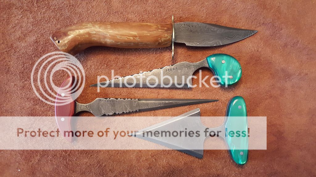 They are called the Four Sisters because they all came out of the same roughly 5 by 7 inch piece of Damascus. This particular billet came from Alabama Damascus here in the USA.The two with the green handles are already spoken for, so here is the info on the other two.