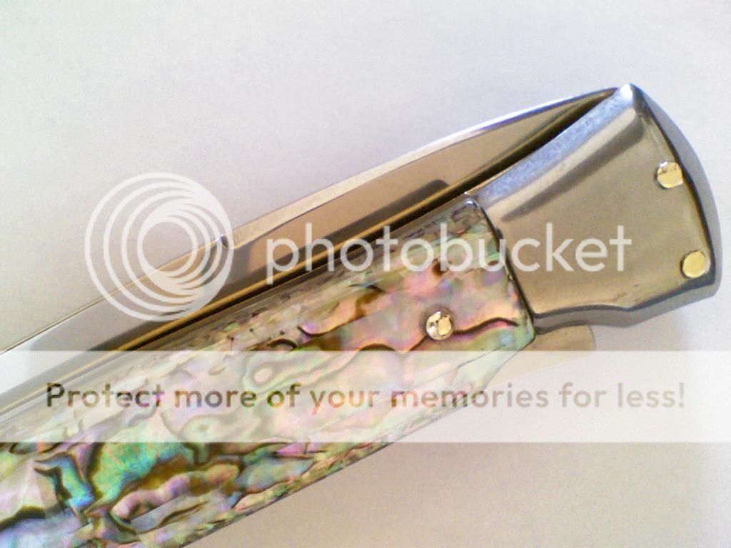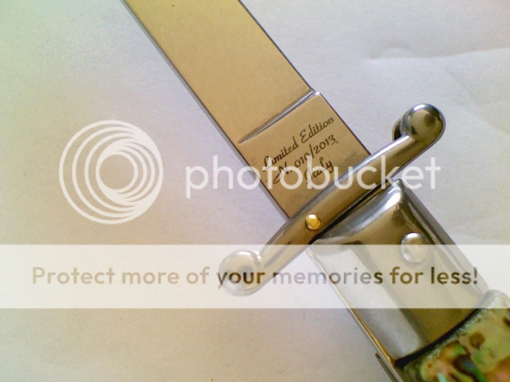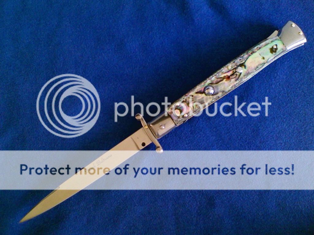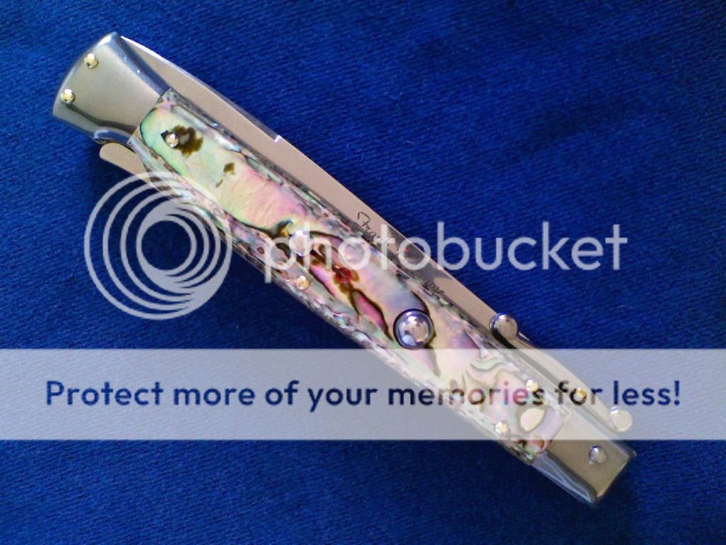 OAl 28 cm, 13 cm Stainless Steel Swedge Blade the side of the blade is lasered in Script Frank Beltrame, Front Tang Stamped Frank B over Italy backside is lasered in Script Limited Edition over N. 019 /2013 over Italy, 15 cm Abalone Scaled Handle the Abalone is mounted on Black Micarta, Stainless Steel Bolsters, Spring, Button, Red Dot Safety and Guards, Brass Liners and Pins.