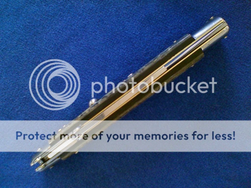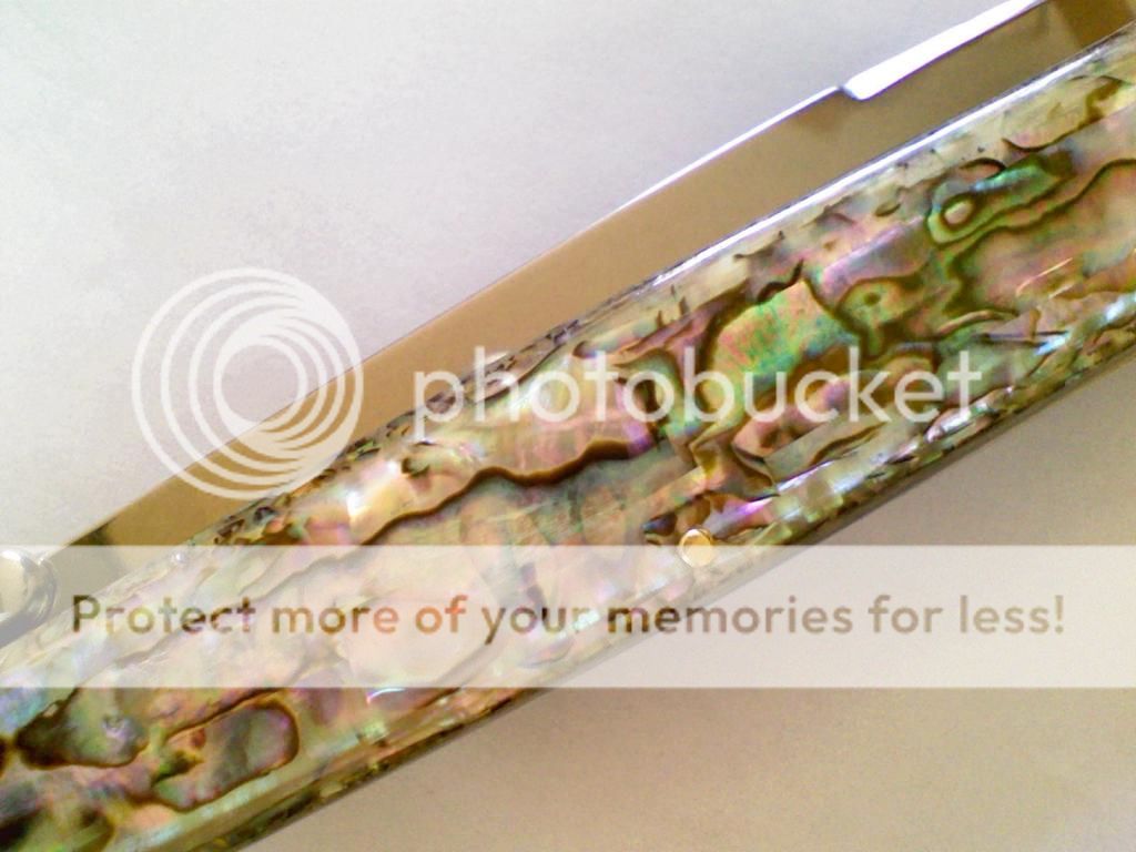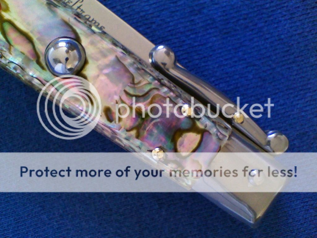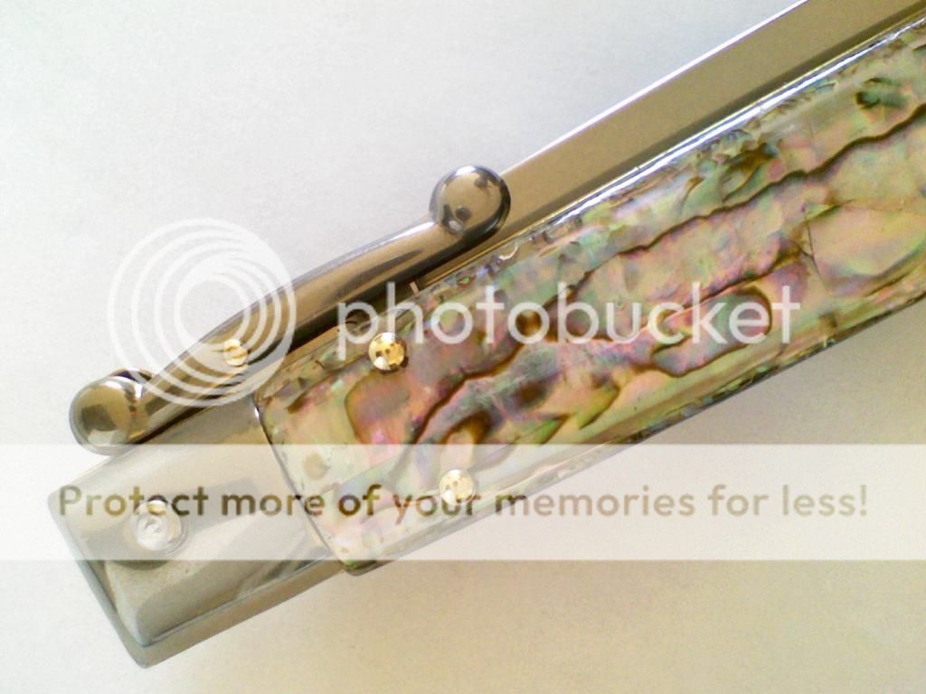 OAl 28 cm, 13 cm Stainless Steel Swedge Blade the side of the blade is lasered in Script Frank Beltrame, Front Tang Stamped Frank B over Italy backside is lasered in Script Limited Edition over N. 019 /2013 over Italy, 15 cm Abalone Scaled Handle the Abalone is mounted on Black Micarta, Stainless Steel Bolsters, Spring, Button, Red Dot Safety and Guards, Brass Liners and Pins.