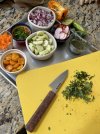 I got a big score of five knives from Francisco today. I am very pleased. The Santok at the top, I got from him back in April or May it is Magnacut with . The slicer and large paring/small petty are also magnacut with stabilized maple.