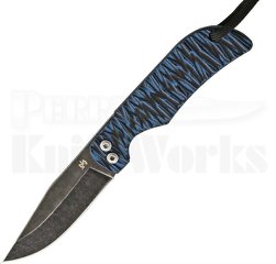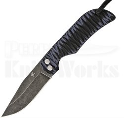 Fred Perin folding neck knife 3 7/8" closed. 2 3/4" black stonewashed finish 440C stainless clip point blade. Comes in either machined blue, brown or grey G-10 handles. Black cord lanyard. Black molded Kydex neck sheath with ball chain lanyard.