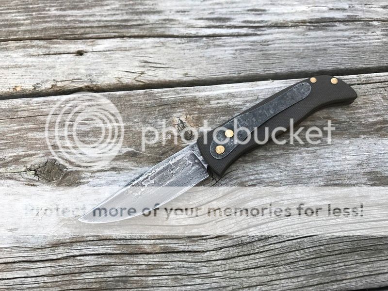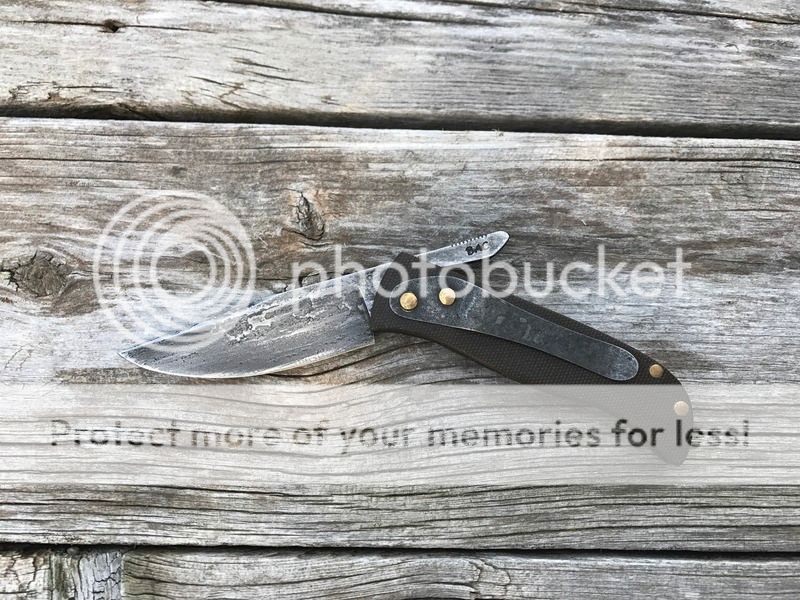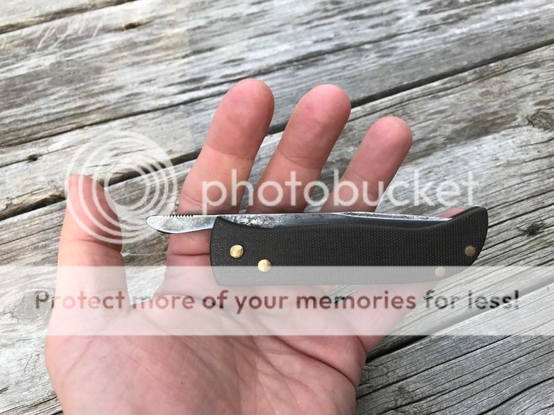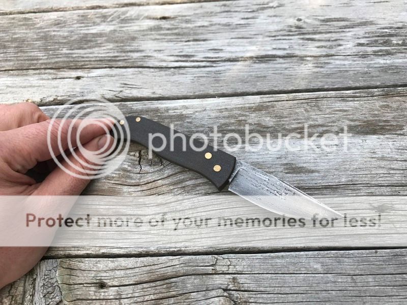 Up for sale is a friction folder in 1/8" W2 and green canvas micarta. The blade is 3" tip to scales and the handle is 4 1/8". Pocket clip is made form thin high carbon steel, heat treated to a spring temper and antique finish. Pivot pin and stop pin are 3/16" brass, peened heads. Spacer pins are 1/8" brass and also peened. Blade is flat ground and has an etched finish. Blade doesn't lay centered when closed therefor priced accordingly at $SOLD shipped CONUS and Canada.