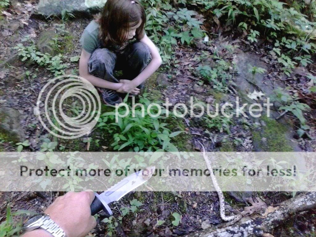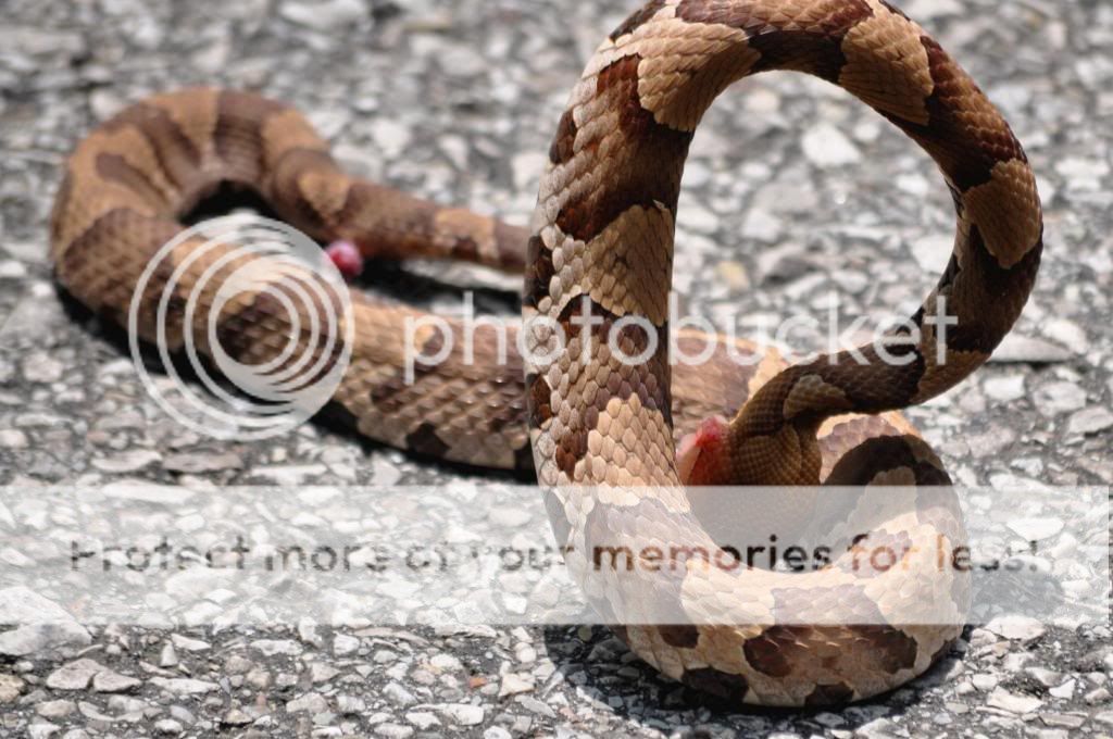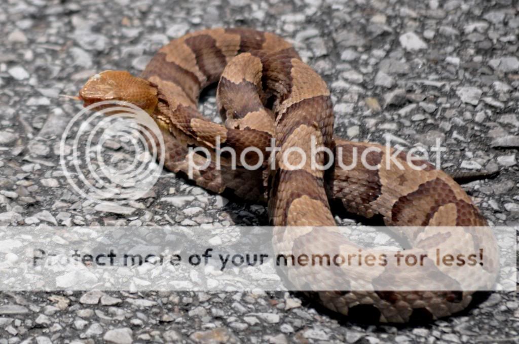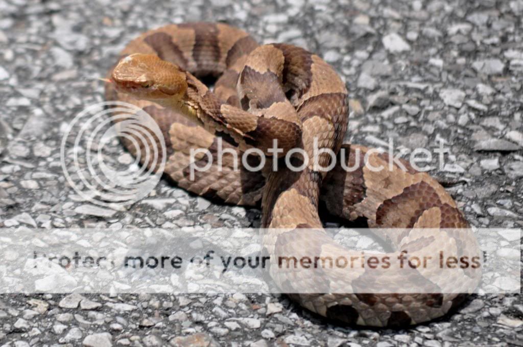 Edit: It has been pointed out to me that I should maybe clarify this situation for those who don't actually know me. The only reason I killed the copperhead in the pictures below is because it was, in my opinion, injured well beyond any reasonable expectation of healing when it struck at the underside of the car that drove over it. It appeared to be fine up until that point. My initial goal was to do the snake and the people on the thirty or forty mountain bikers headed that way a favor and relocate the snake onto some large rocks on the opposite side of the road from where my daughter and I were going hiking. I just wanted to observe the snake's physical condition and disposition, and took a few detailed photos. Then came a car that just couldn't be bothered to go around the snake as I was motioning. It instead straddled the snake not trying to run over it. Apparently the snake was disoriented and struck at the underside of the car as it went over and that didn't work out very well for the snake. I know that Copperheads are venomous snakes, but from my experiences their numbers have drastically declined in recent years, and this was not in a populated area. I have seen enough death and bloodshed, I will only ever harm any living thing for three reasons; defense, hunger, or euthanasia. When it comes to wild animals of all types, I'd much rather observe and photograph, and just live and let live. However, once all hope of a rescue operation had passed, my severely pragmatic side took over. The analyst and scientist in me just couldn't pass up the opportunity for an up close study of the snake, and the teacher in me couldn't pass up the chance to teach my daughter some things she needs to know about this area and the creatures that inhabit it. After a brief analysis of the snake as a whole by myself and my daughter, I dispatched the snake by the quickest and most merciful method I had at my disposal at the moment. I have a tendency to document as much of any event as I can, I think my photo-heavy posts bear witness to this. The pics of the snakes euthanasia are not an attempt at cool factor, there is never anything cool about the death of an innocent. They were just a response to earlier comments from family and friends about me letting my daughter handle a venomous snake, and also in hopes of nipping any future such comments in the bud. It was my way of illustrating that though I may be a bit crazy...I am neither crazy enough, nor stupid enough to let my young daughter handle a live venomous snake or even a dead one with the fangs still present that could lead to my daughter being injured.