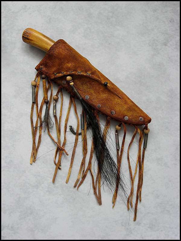 Next one. steel - high carbon NC6 / 3.0 mm [0.118"] length - 257 mm [10.118"] blade - 135 mm [5.315"] handle - stag, buckskin, copper, artificial sinew sheath - cowhide leather, buckskin, copper, brass, bone, wood, artificial sinew, horse hair.