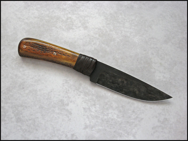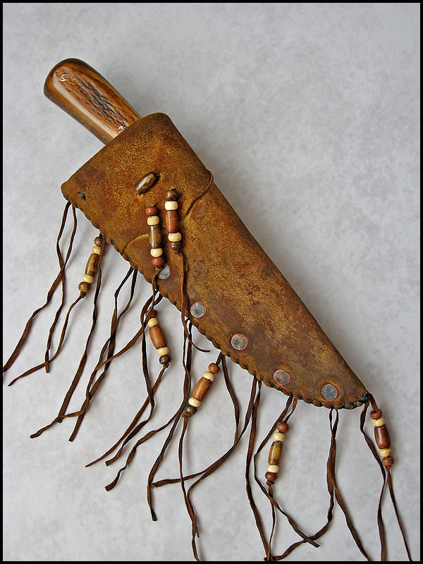 Frontier for sale. steel - NC6 high carbon / 3.7 mm [0.146"] length - 230 mm [9.055"] blade - 115 mm [4.527"] handle - stag, copper, buckskin sheath - cowhide leather, buckskin, copper, bone, artificial sinew Price - 333 USD SOLD Included International Priority Mail