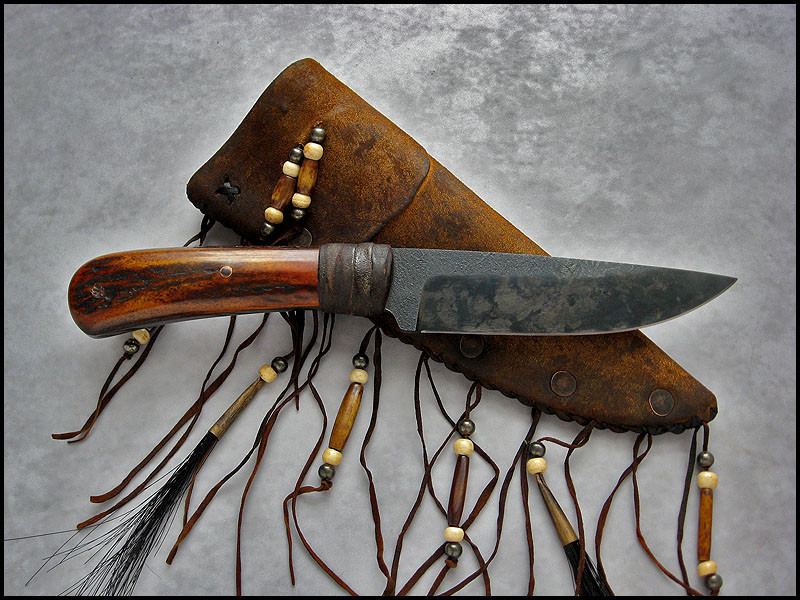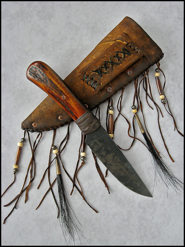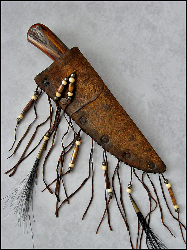 sheath - cowhide leather, buckskin, copper, bone, pewter, horse hair, artificial sinew