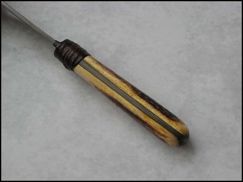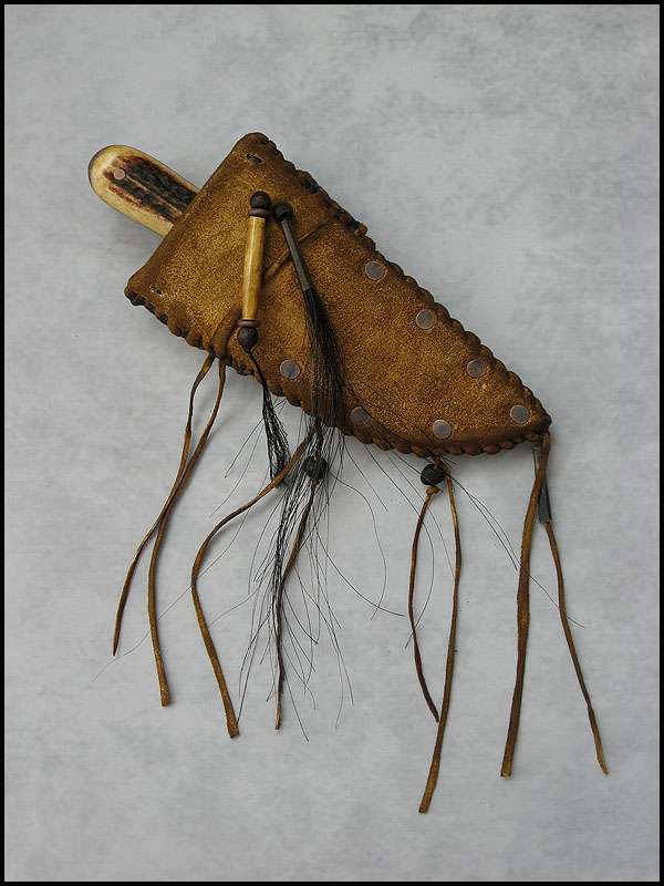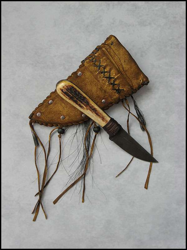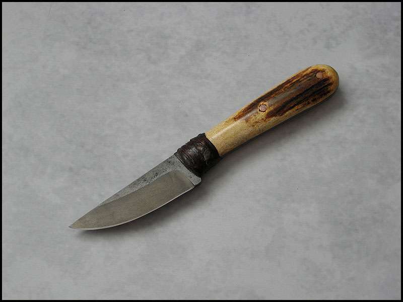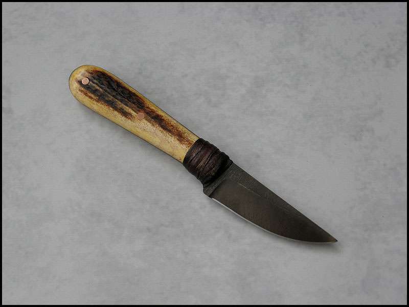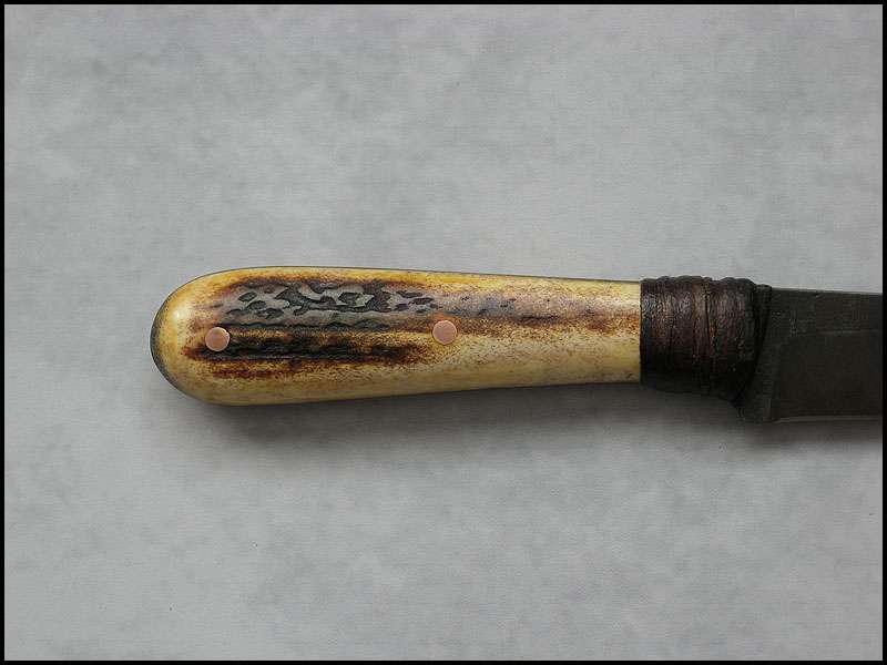 The little companion steel - nc6 / 3 mm [0.118"] length - 175 mm [6.890"] blade - 75 mm [2.953"] handle - stag, leather, copper sheath - cowhide leather, buckskin, copper, bone, wood, horse hair.