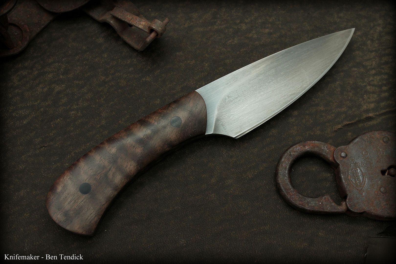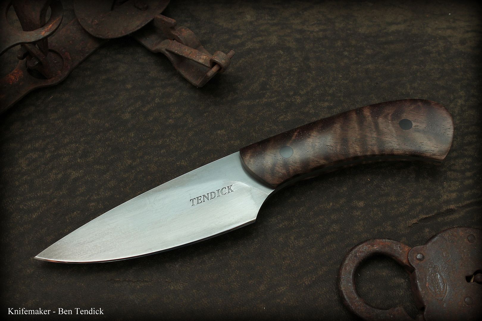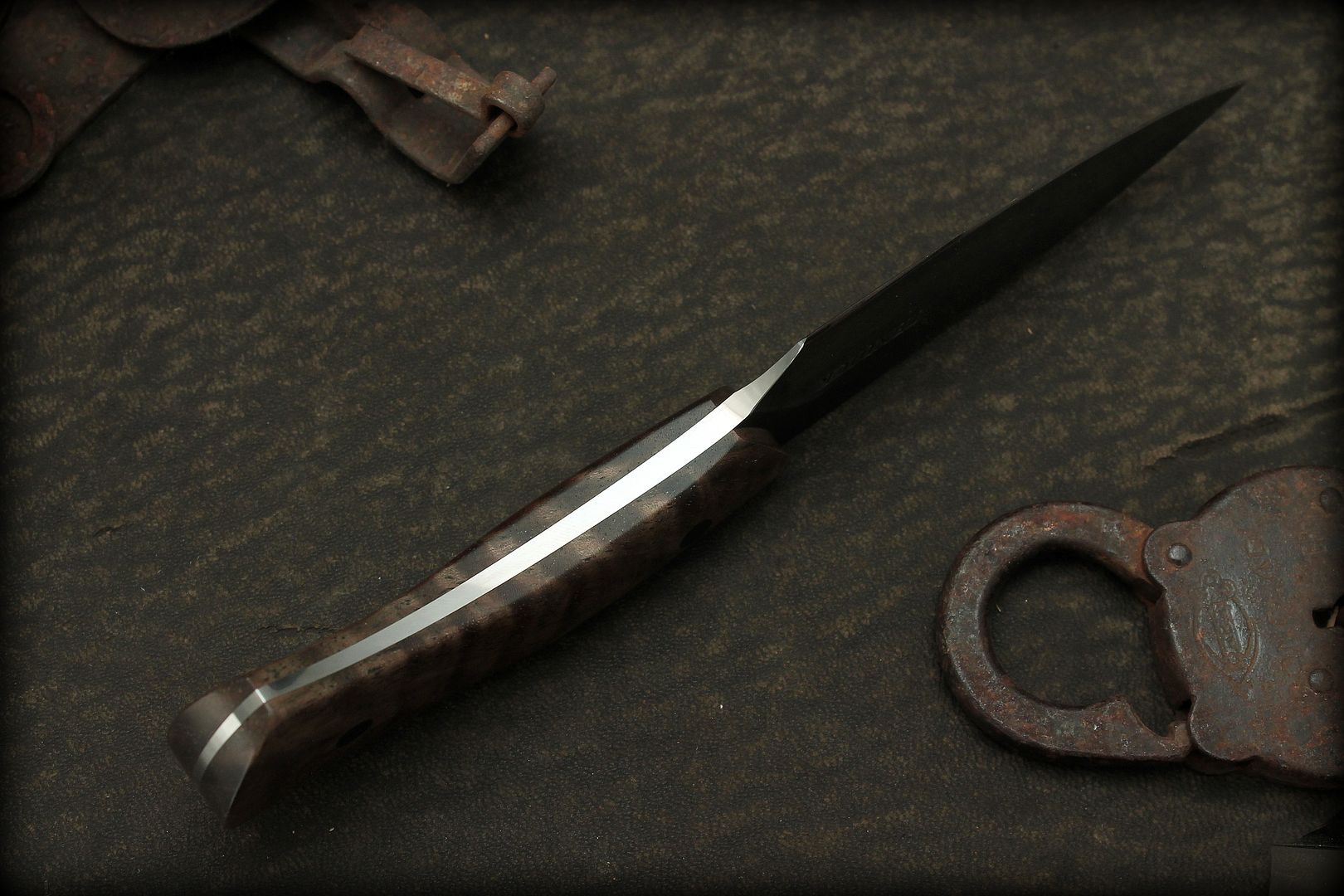This one is 80crV2 (Awesome, tough carbon steel) with an antiqued blade and tapered tang. The scales are some really nice Stabilaized Curly Bastogne walnut, they are highly polished and look fantastic in hand.
